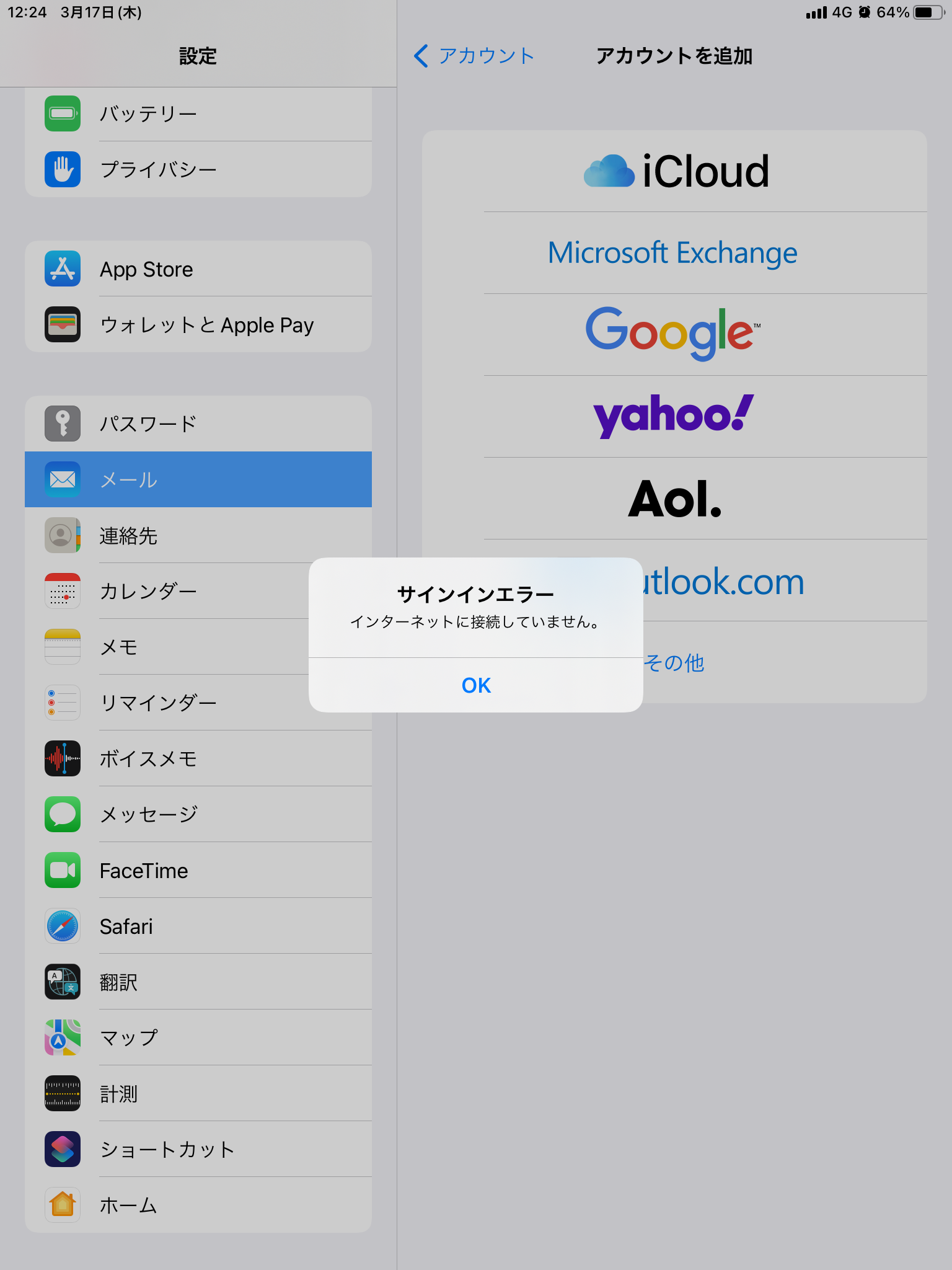 設定→メール→アカウント→アカウントを追加→google→サインエラー インターネットに接続していません