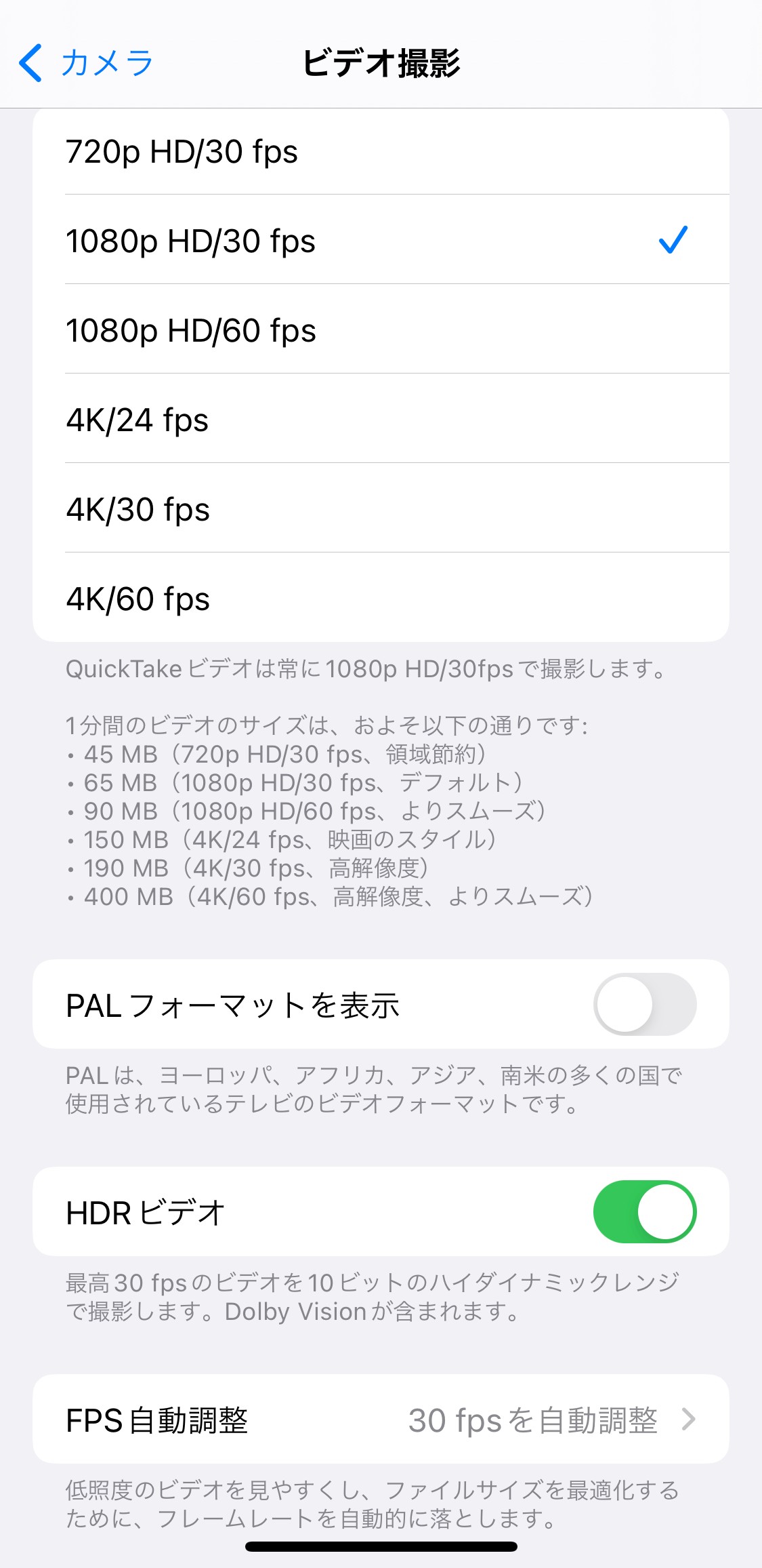 8.「1080p/30fps」 HDRビデオ「off」 他初期値