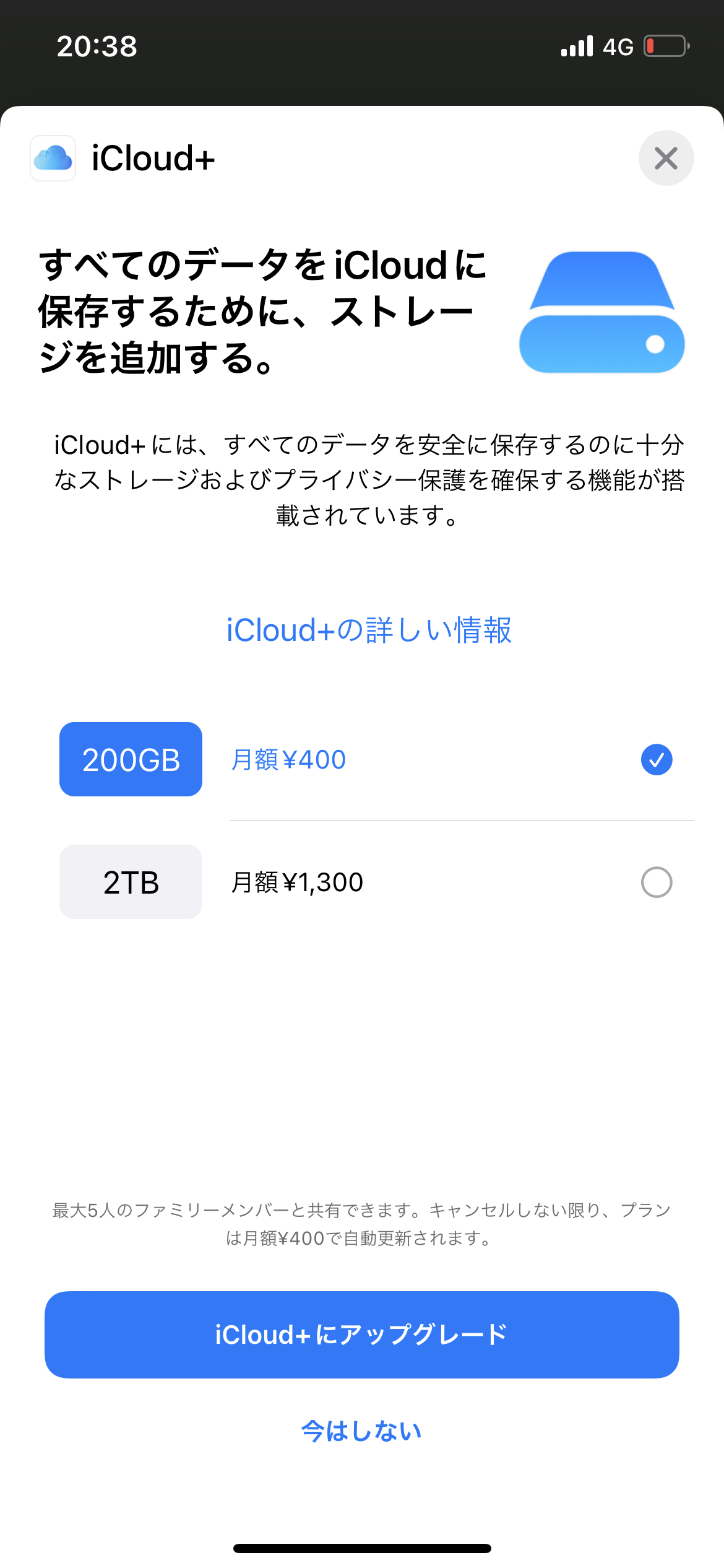 iCloud ストレージプランは「設定」 → 「Apple ID」 → 「iCloud」 → 「ストレージを管理」 → 「ストレージプランを変更」からアップグレード/ダウングレードできます。