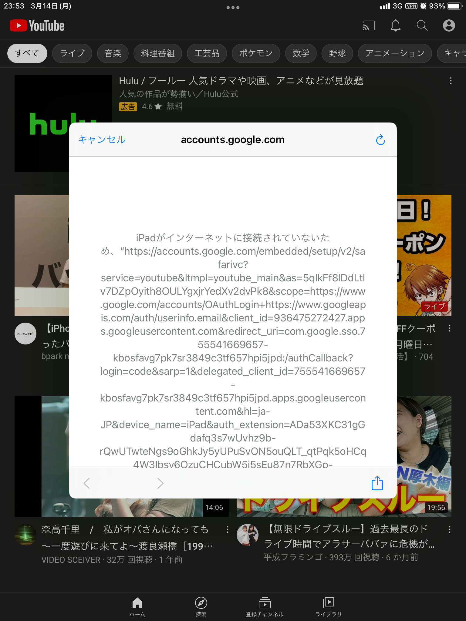 YouTubeにログインしようとすると、ipadがインターネット接続されていないと表示され、