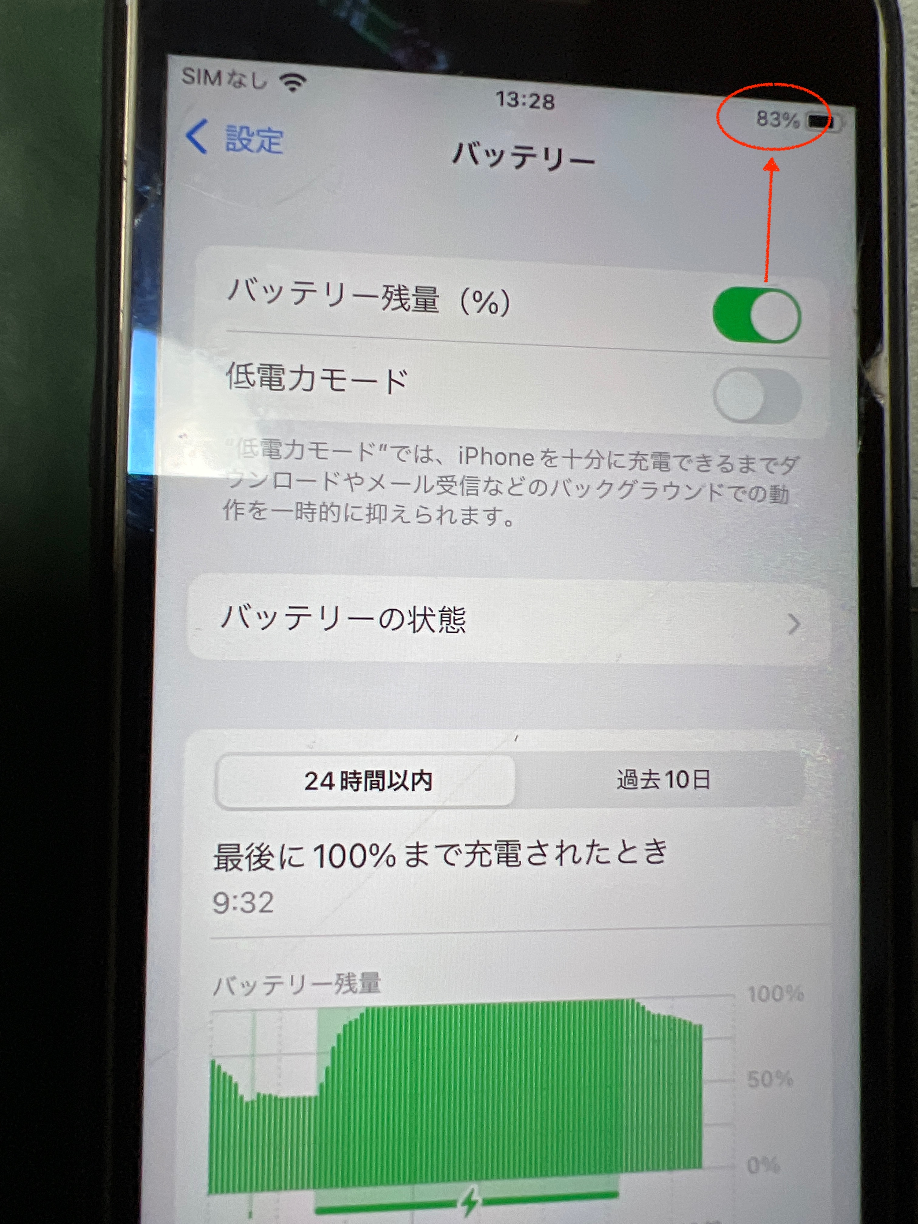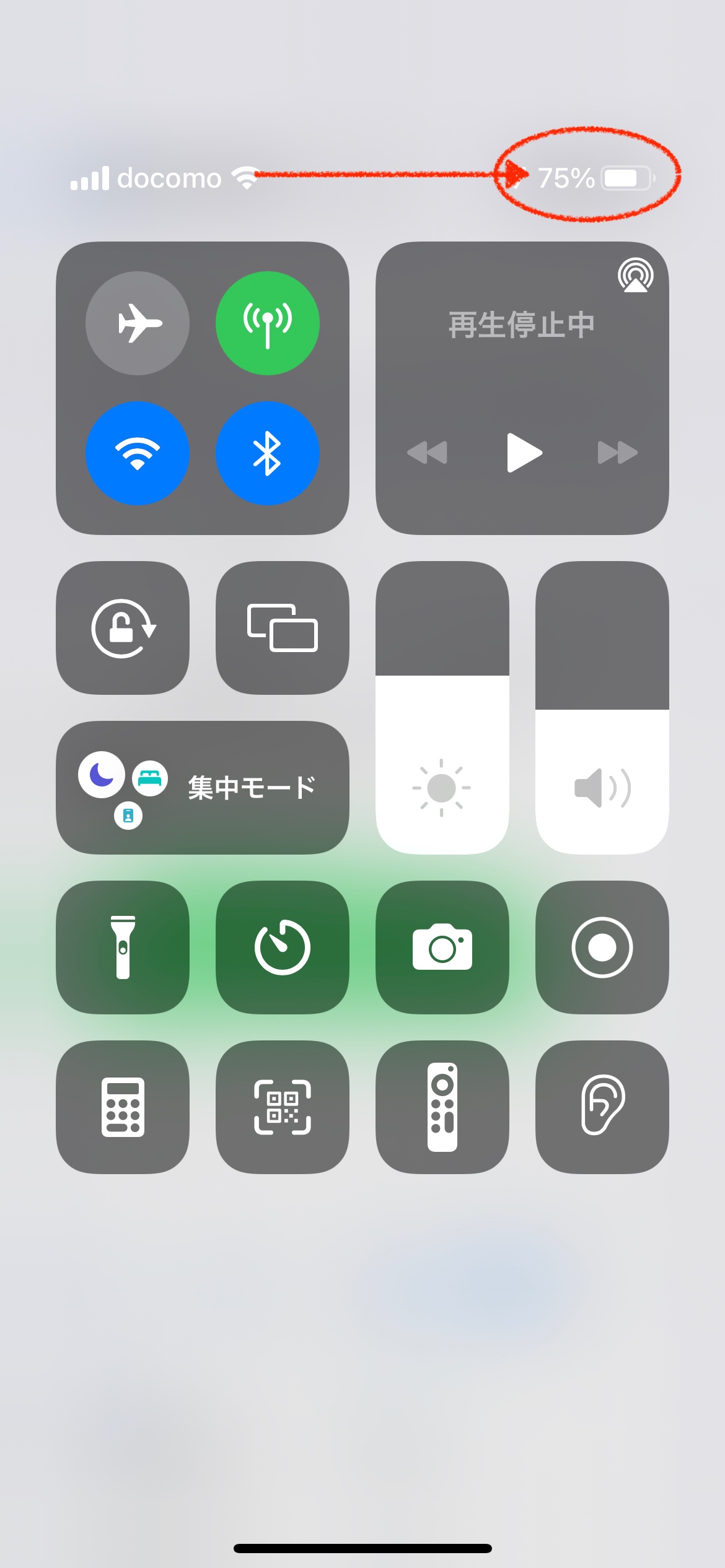 画面の右上から左斜め下にスワイプするとコントロールセンターが表示され、そこにバッテリーの%が表示されます。