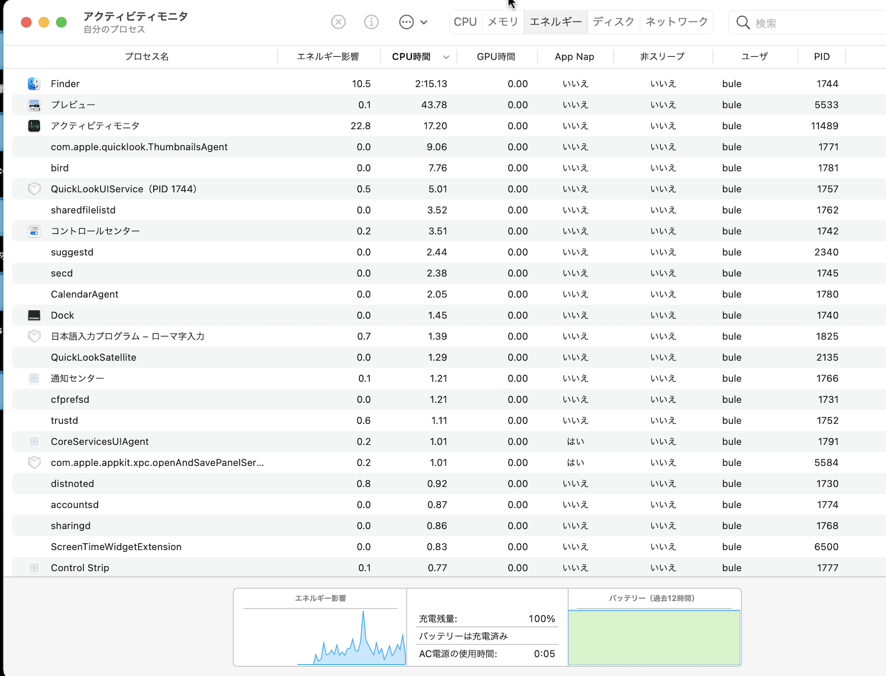 アプリケーションのCPU時間を知るには? mac エネルギー