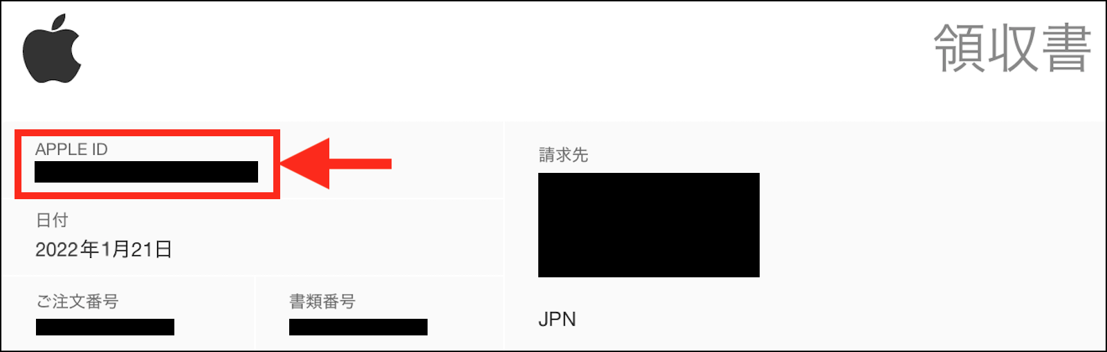 Apple から届く「領収書」メールに記載されている「Apple ID」(下の画像赤枠部分)は、サブスクリプションの登録時(または解約時)に使用した Apple ID と同じ でしょうか?