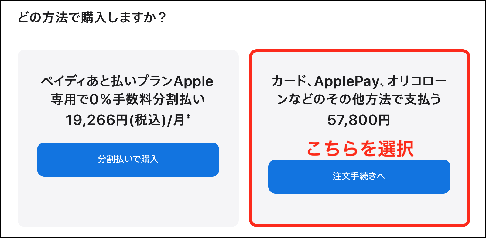 iPad の購入画面で、下の画像の様に 「カード、Apple Pay、オリコローンなどのその他方法で支払う」を選択 されていますでしょうか?