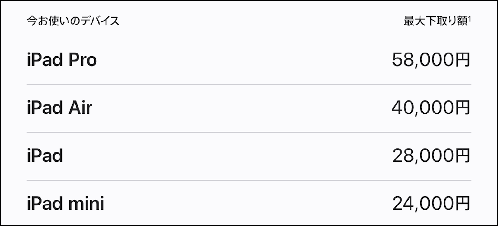 下取り額は、下取りに出すデバイスの状態やモデルによって異なる 場合が有りますが、機種別の最大下取り額は下の画像の様になっています。