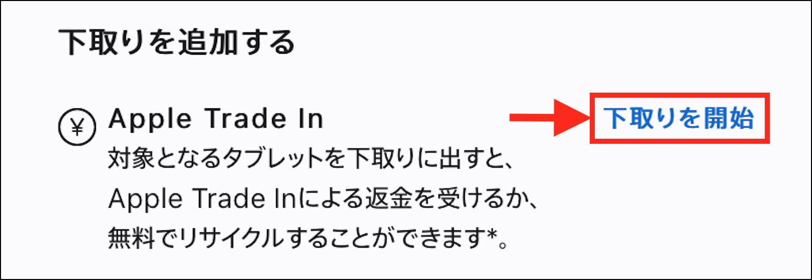 1. iPad の購入ページで「下取りを開始する」のリンクをクリック(またはタップ)。