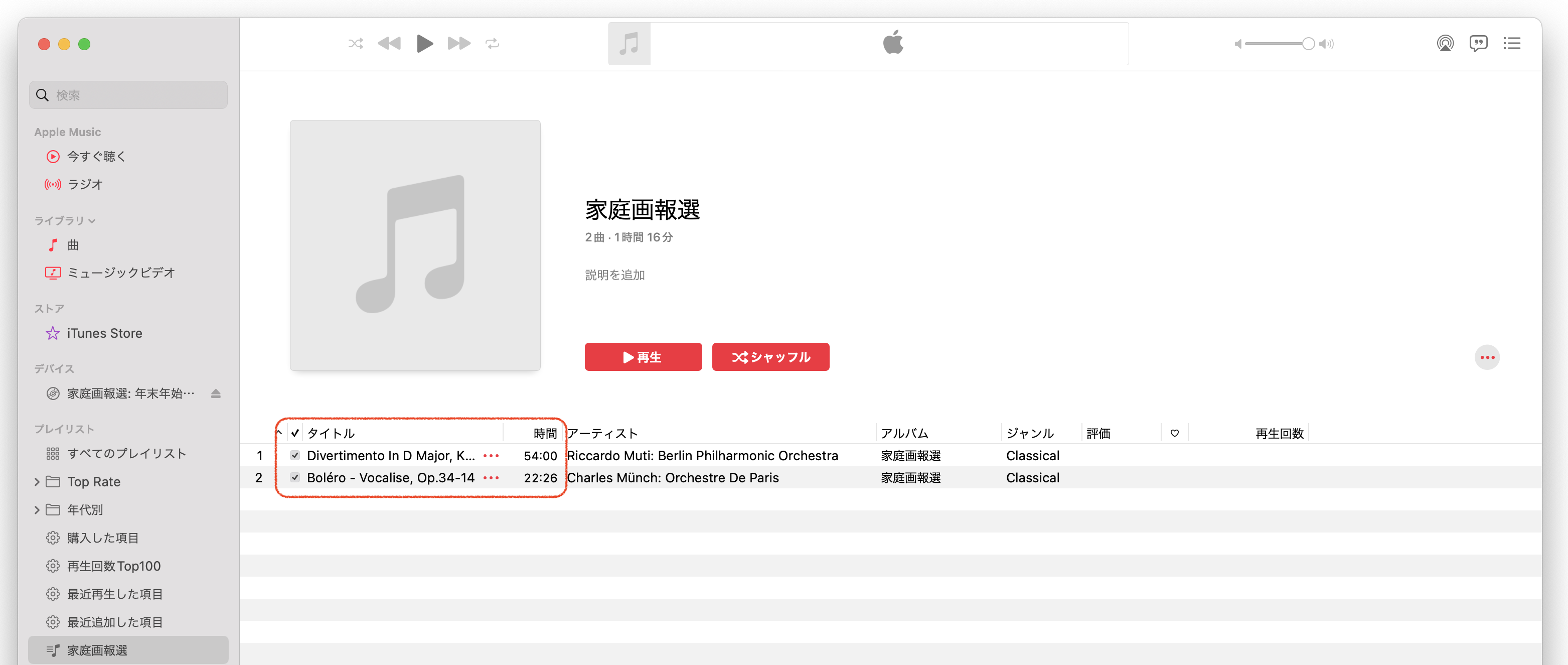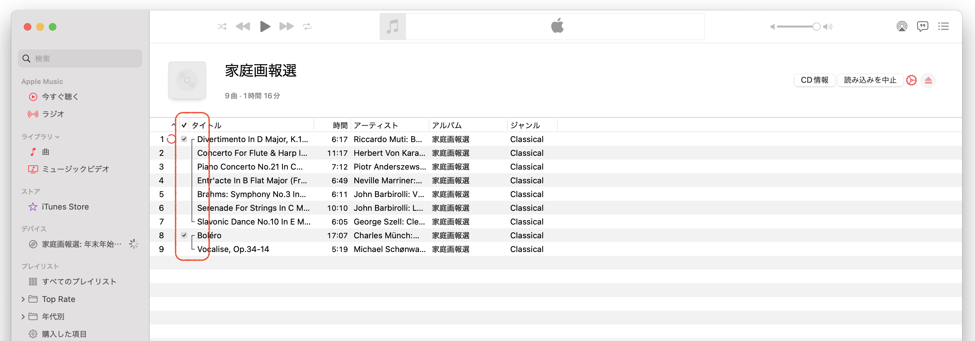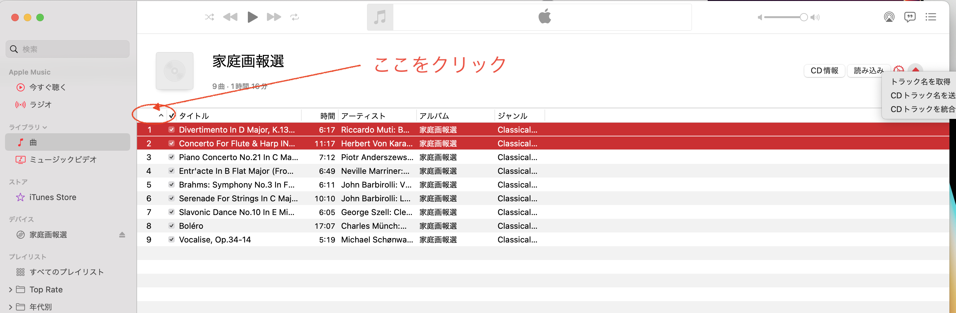 下記のとおり、トラック番号の見出しをクリックして昇順に並ぶようにしてください。("⌃"が表示される状態)
