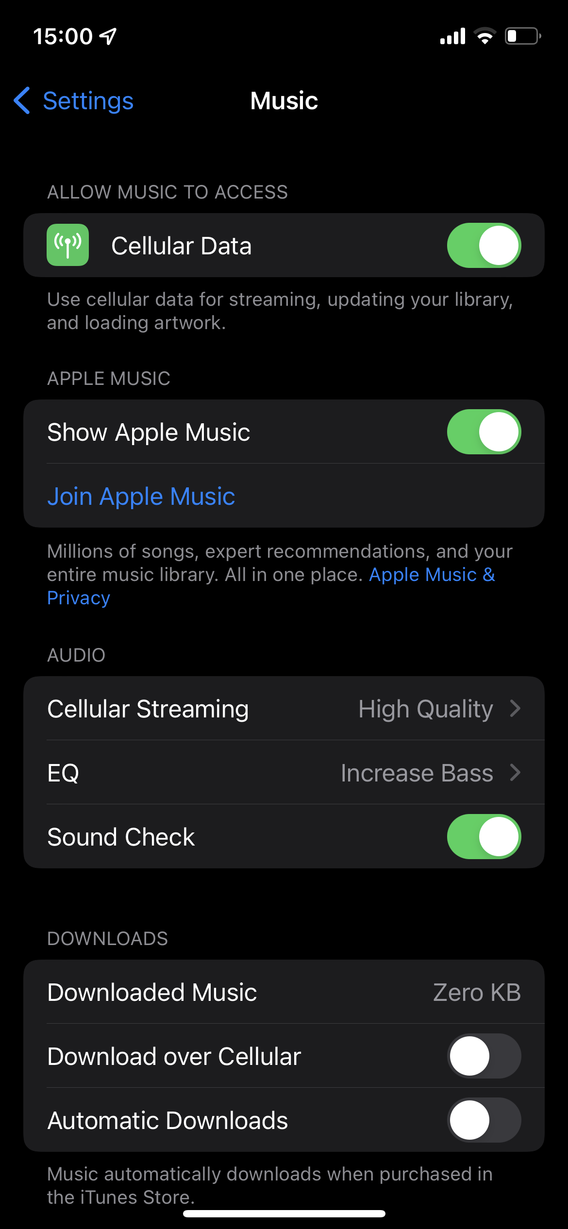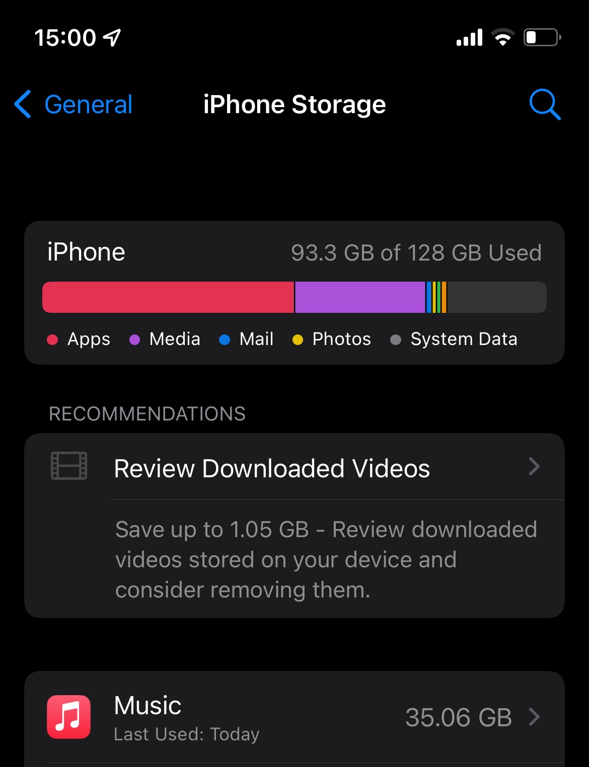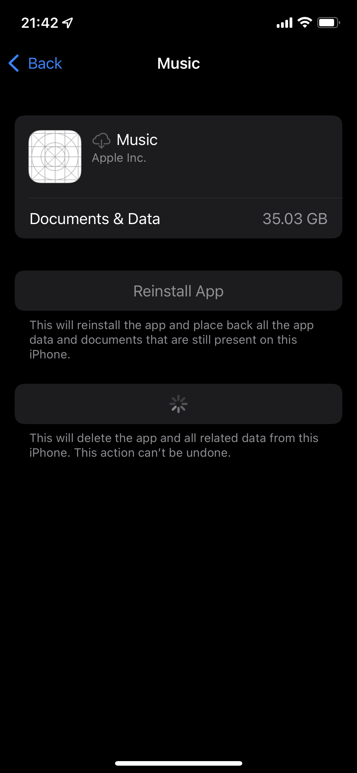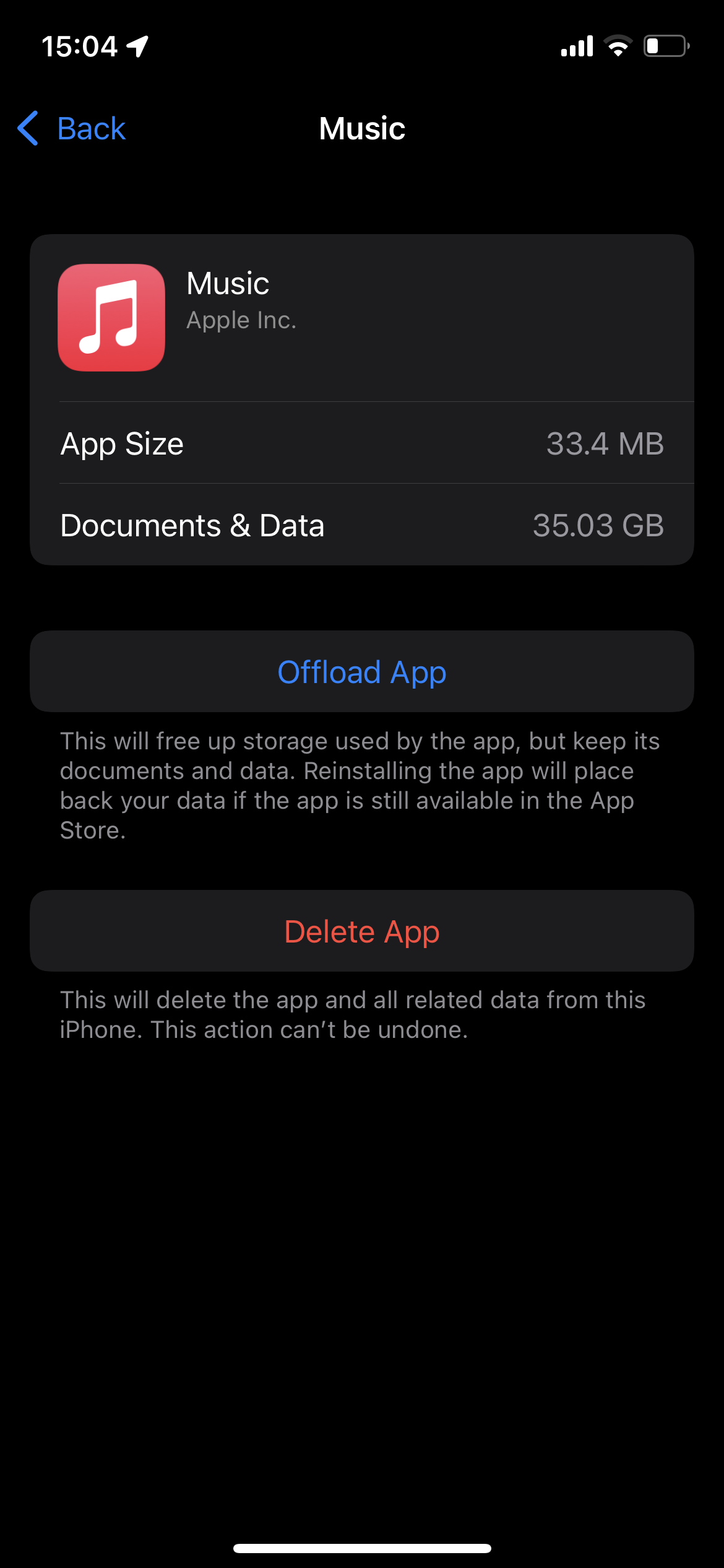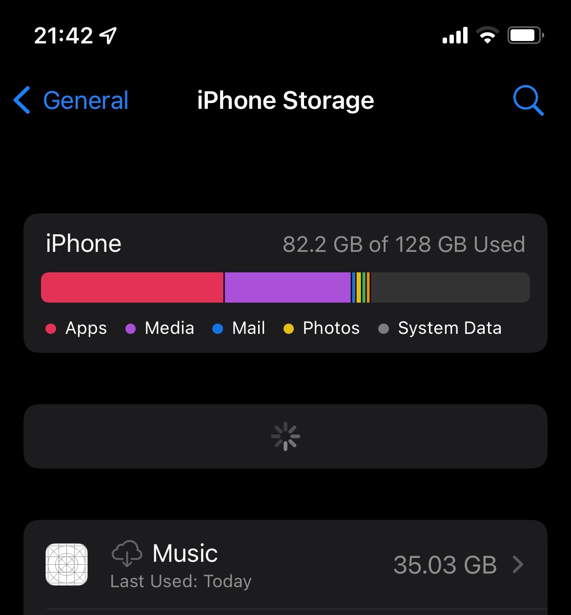 設定からiPhoneのストレージを見ると確かに35GB分の容量を使っているのですが、Musicの設定に行くとダウンロードされた曲は0kbと表示されます。