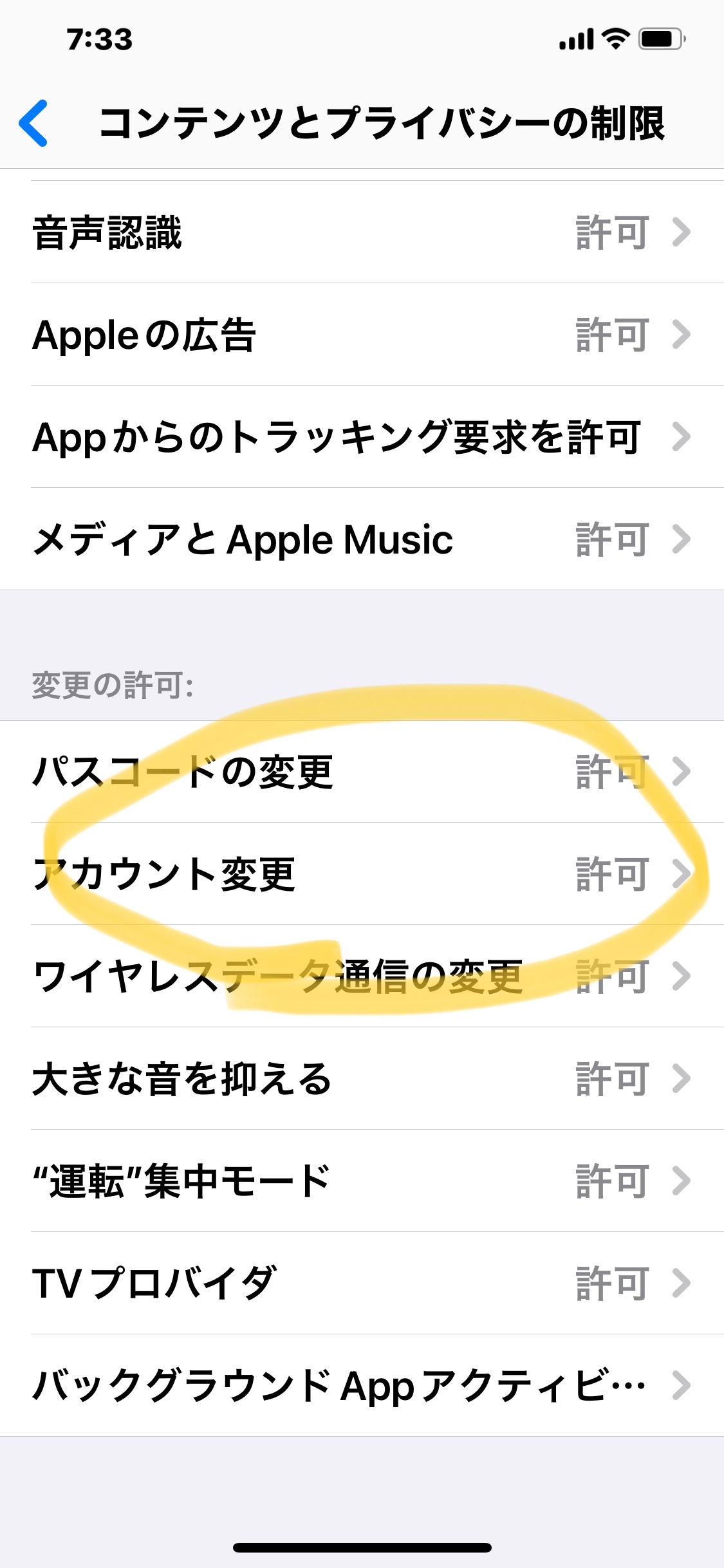 設定>スクリーンタイム>コンテンツとプライバシーの制限>アカウント変更>「許可しない」 になっていませんか?