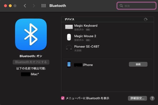 iMacとiPhoneとの連携が出来なくて、iPhone側に、[このMacはサポートされていません]と表示され、AirDropも何故か出来なくて、(今は何故か回復済み) iMac側のBluetoothを切ってみようと思い試みたところ、環境設定画面でオフにしようとするとボタンが暗くなっていてオフに出来ません。