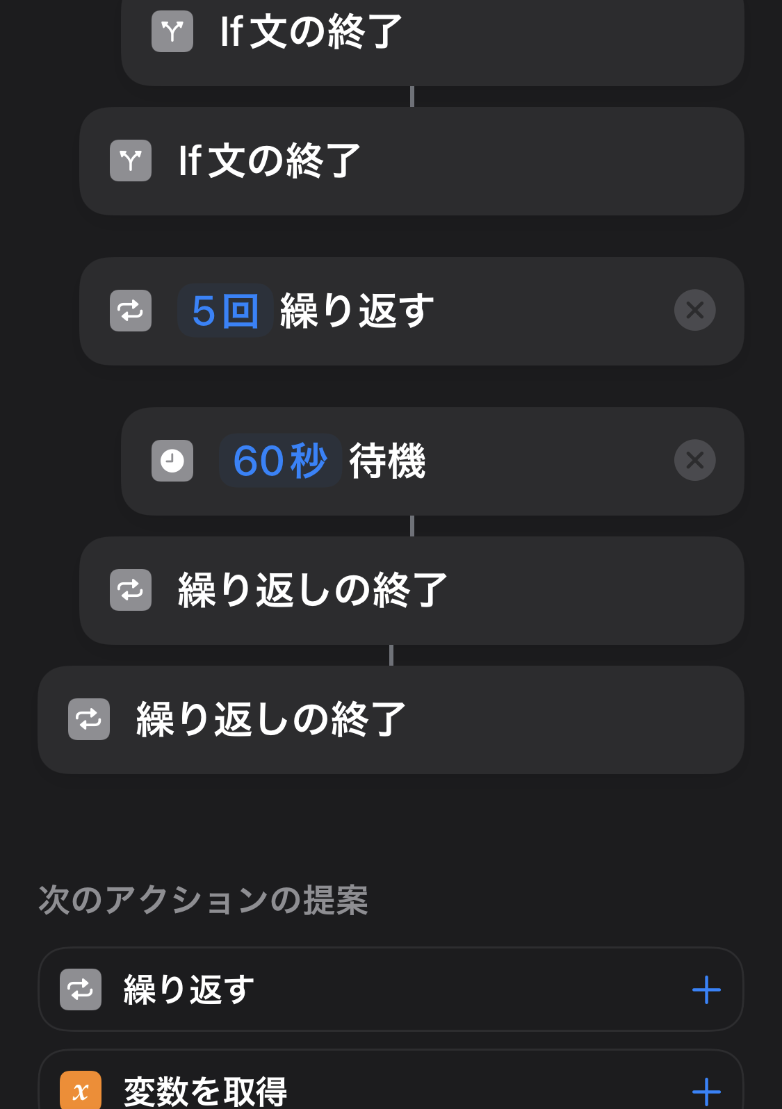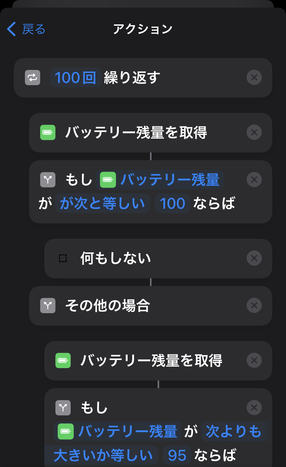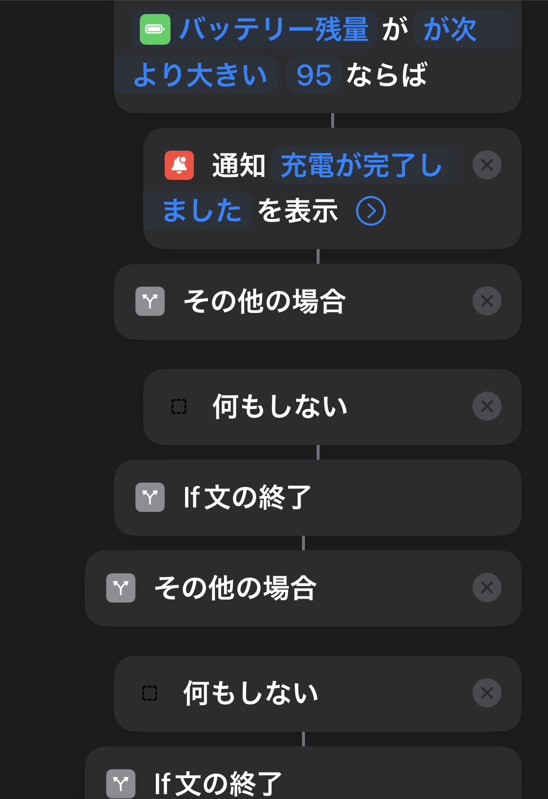 *状況* iphoneが電源に接続されている際に、充電がだいたい完了した時の通知をさせたいと思いました。充電が95%以上になったあと5分数え、そのあと95%を超える充電量であれば通知を送信します。また、100%になった後は通知を行わないようにしました。95%に至らない場合は5分待機し、もう一度一連の動作を繰り返します。
