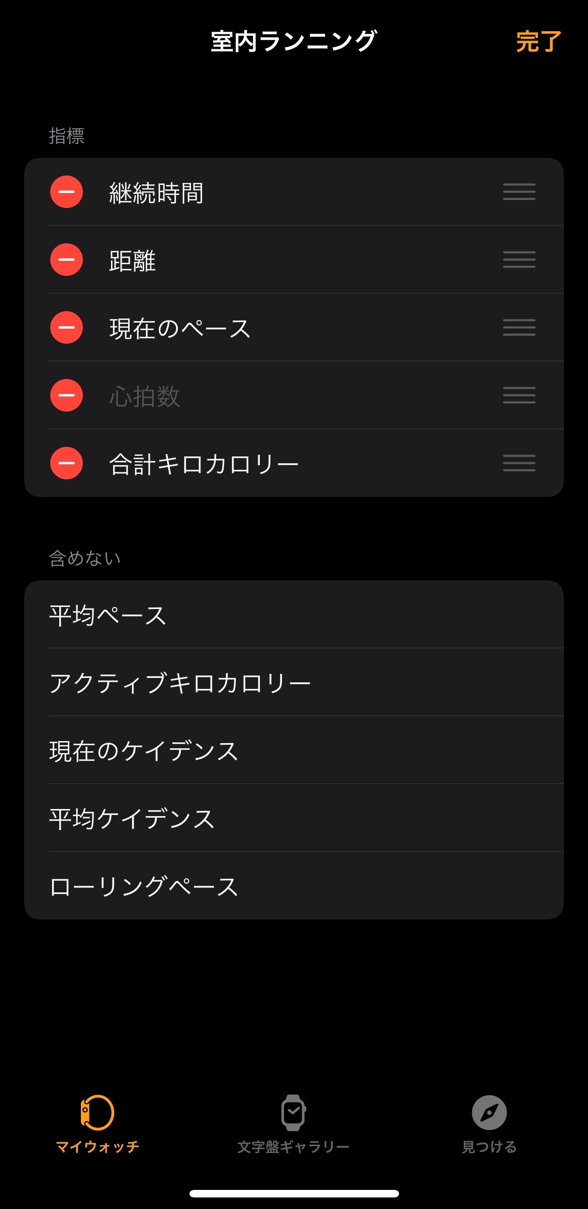 他のワークアウトでは心拍が選択できていますが、ウォーキングとランニングになると室内、屋外共に心拍が選択不可です。