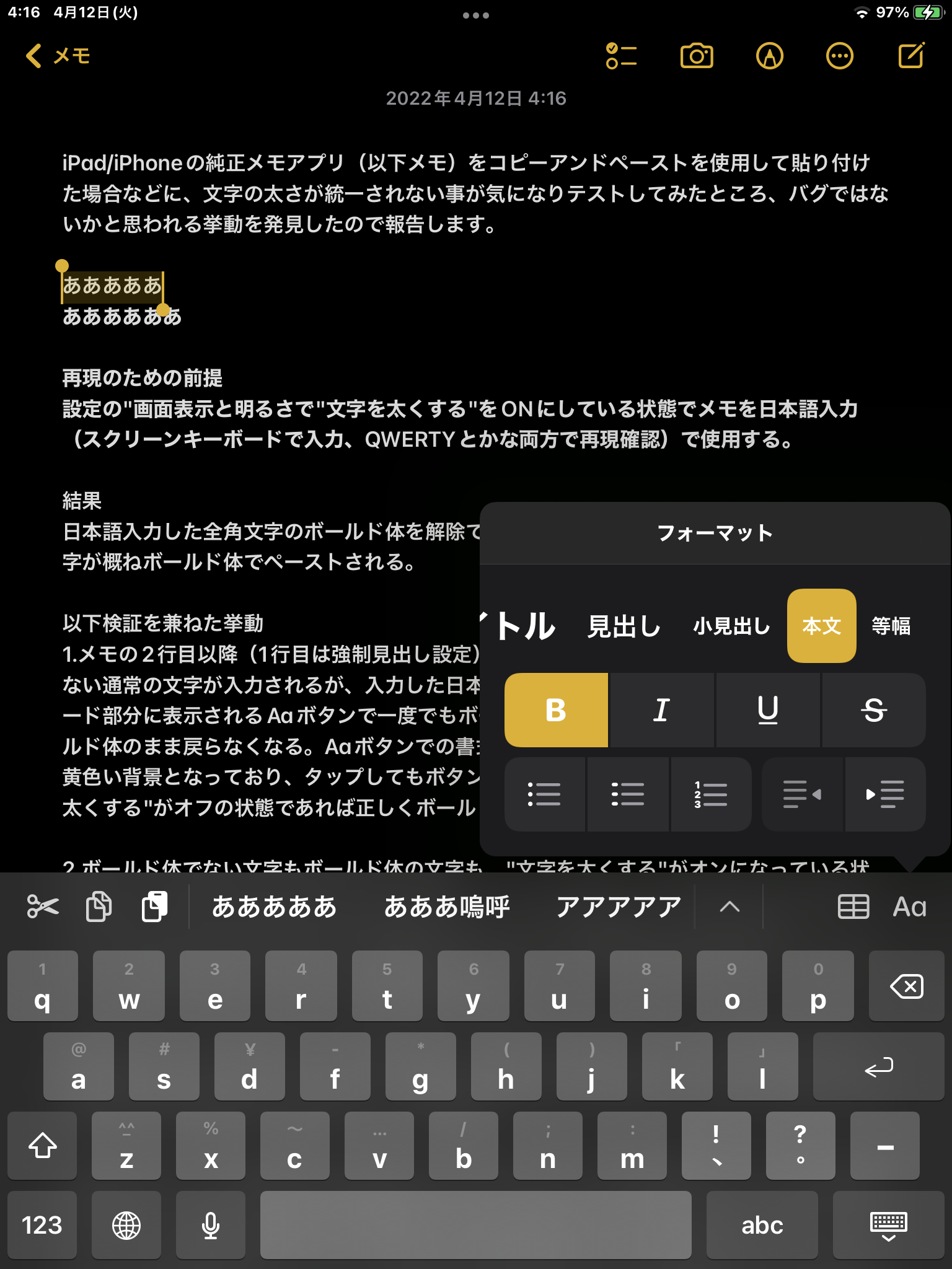 iPhone/iPadにて純正メモアプリでボールドが解除されない現象と解決策