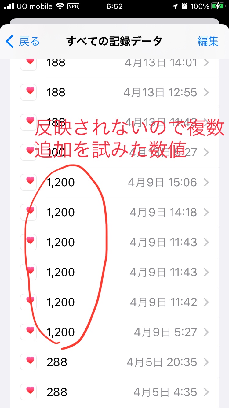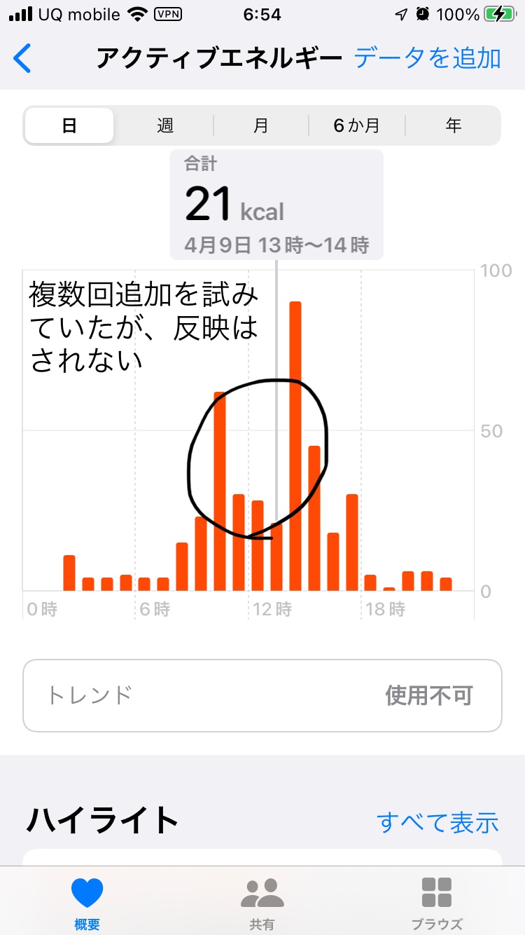 ヘルスケアにおいて、データ連携できていなかった時にアクティブエネルギーのデータ追加で編集します。その際に度々、追加が反映されないことがあります。