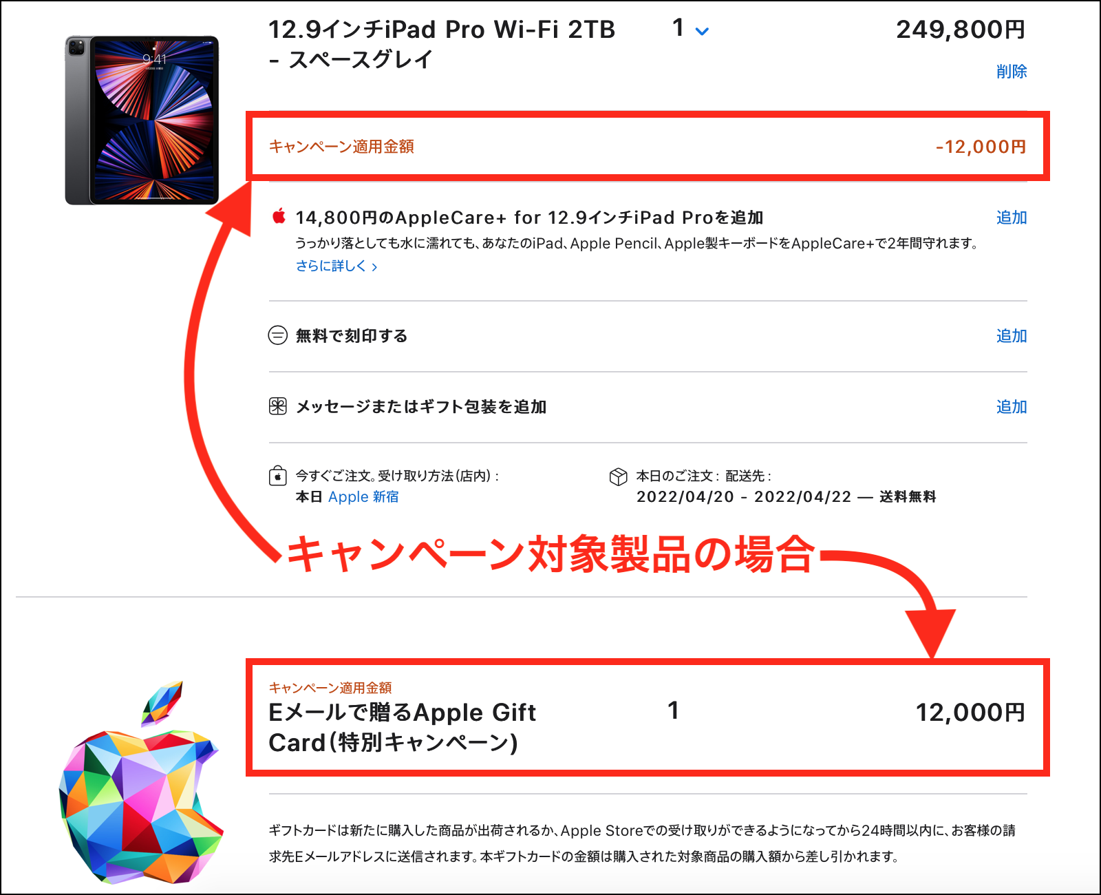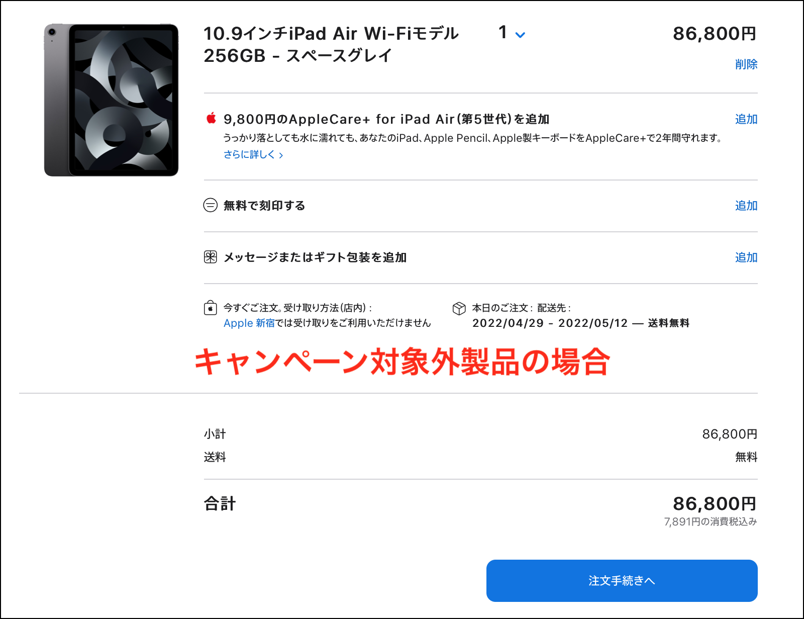 (つまり、キャンペーン対象の iPad Air(第4世代)を購入する場合は、2022 年 2 月 3 日 〜 2022 年 3 月 17 日までに購入する必要が有りました)
