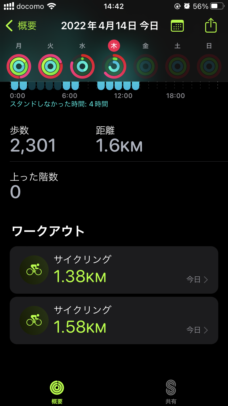 今日サイクリングのワークアウトをおこなったが、アクティビティの時間が全く加算されなかった。