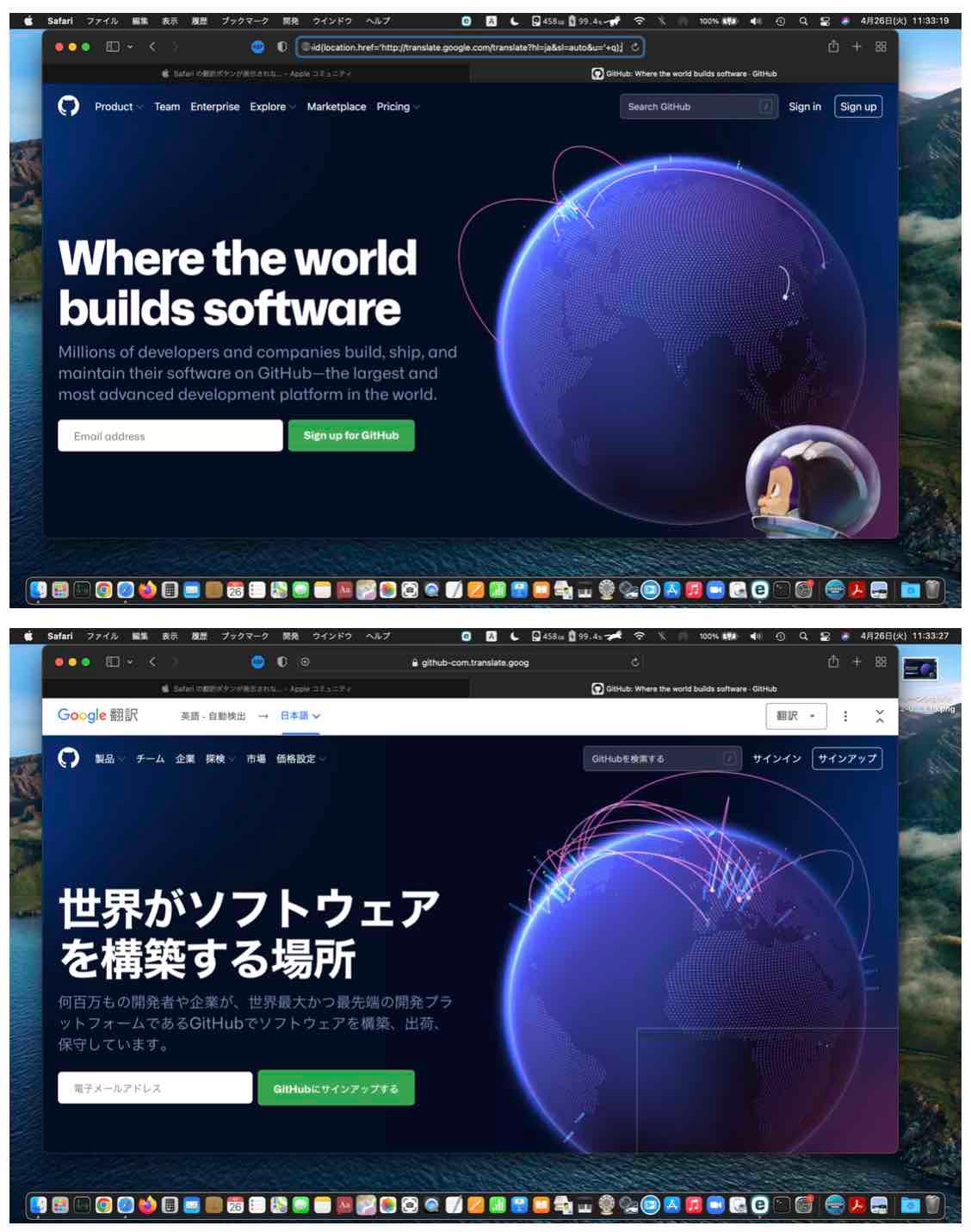 (Apple サポートの環境で、GitHub の Web サイトに「翻訳」ボタンが表示される場合は、Ts_Neko さんの環境の問題)