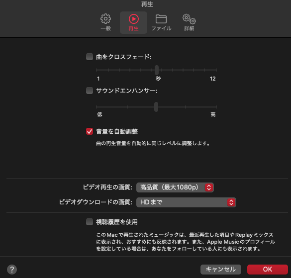 また、AppleMusicに登録されると表示されるオーディオの品質も設定から消えていました。