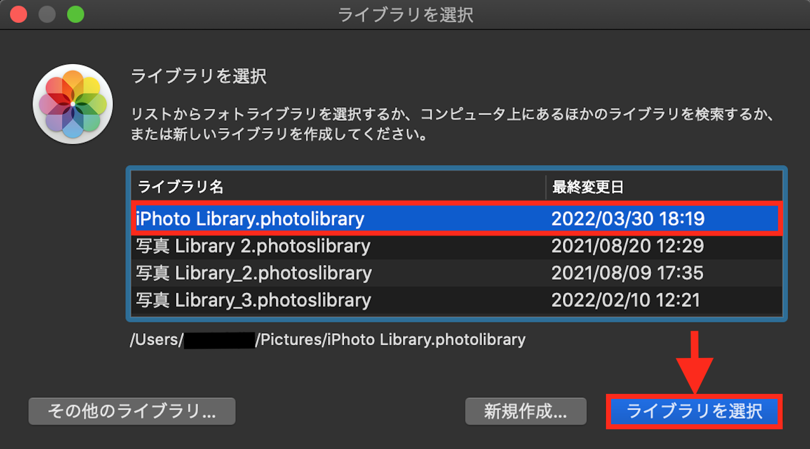 「option」キーを押しながら「写真.app」を起動 すると表示される、「ライブラリを選択」ウインドウで、下の画像の様に 「写真.app」に移行したい「iPhoto ライブラリ」を選択し、「ライブラリを選択」ボタンをクリック して下さい。