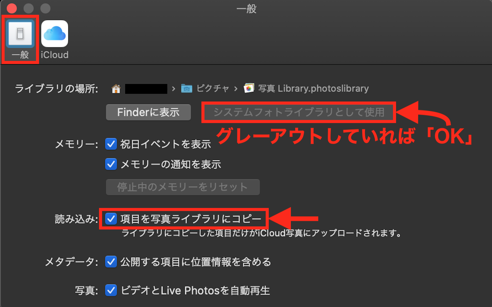 次に、「写真」メニュー >「環境設定」>「一般」タブで、下の画像の様に 「システムフォトライブラリとして使用」ボタンをクリックして、「システムフォトライブラリとして使用」ボタンがグレーアウトしている事と、「読み込み」の「項目を写真ライブラリにコピー」の項目にチェックが入っている事を確認 して下さい。