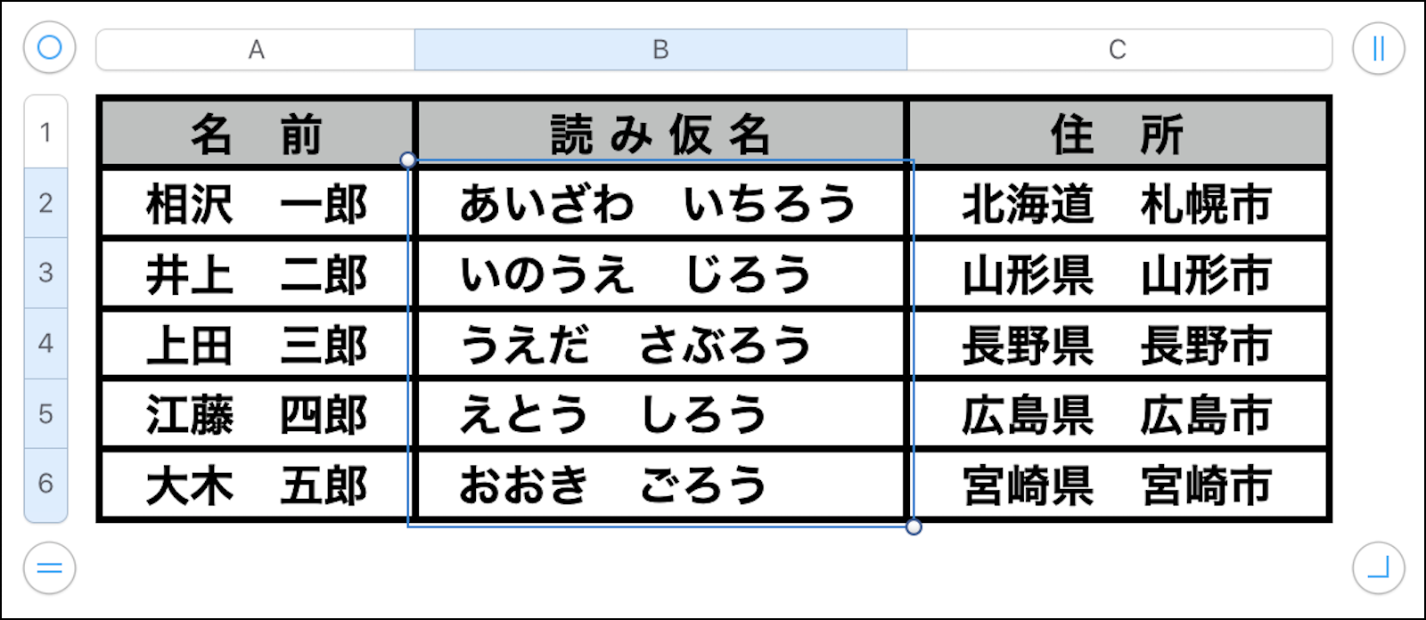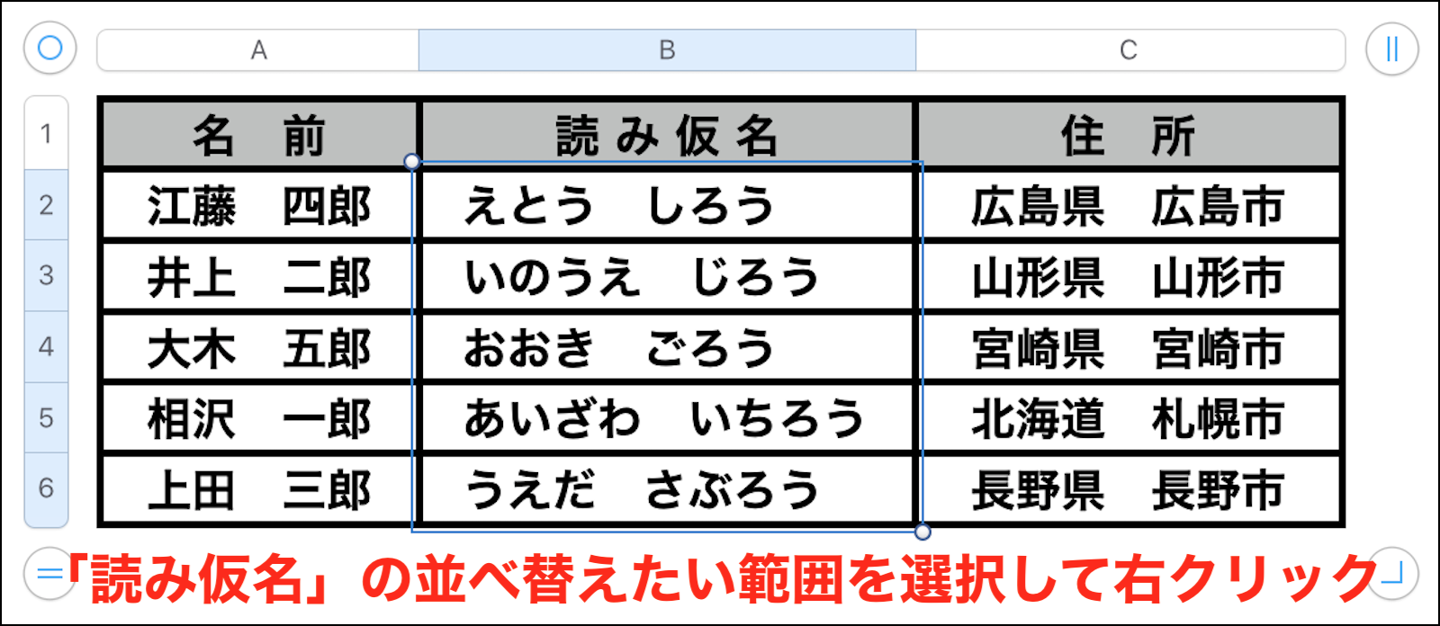 「Numbers」で名簿を作成する場合ですが、漢字の場合は期待通りに並べ替えてくれません ので、下の画像の様に「名前」の列の後に「読み仮名」の列を追加し、「読み仮名」の列の並べ替えたい範囲を選択して右クリック。
