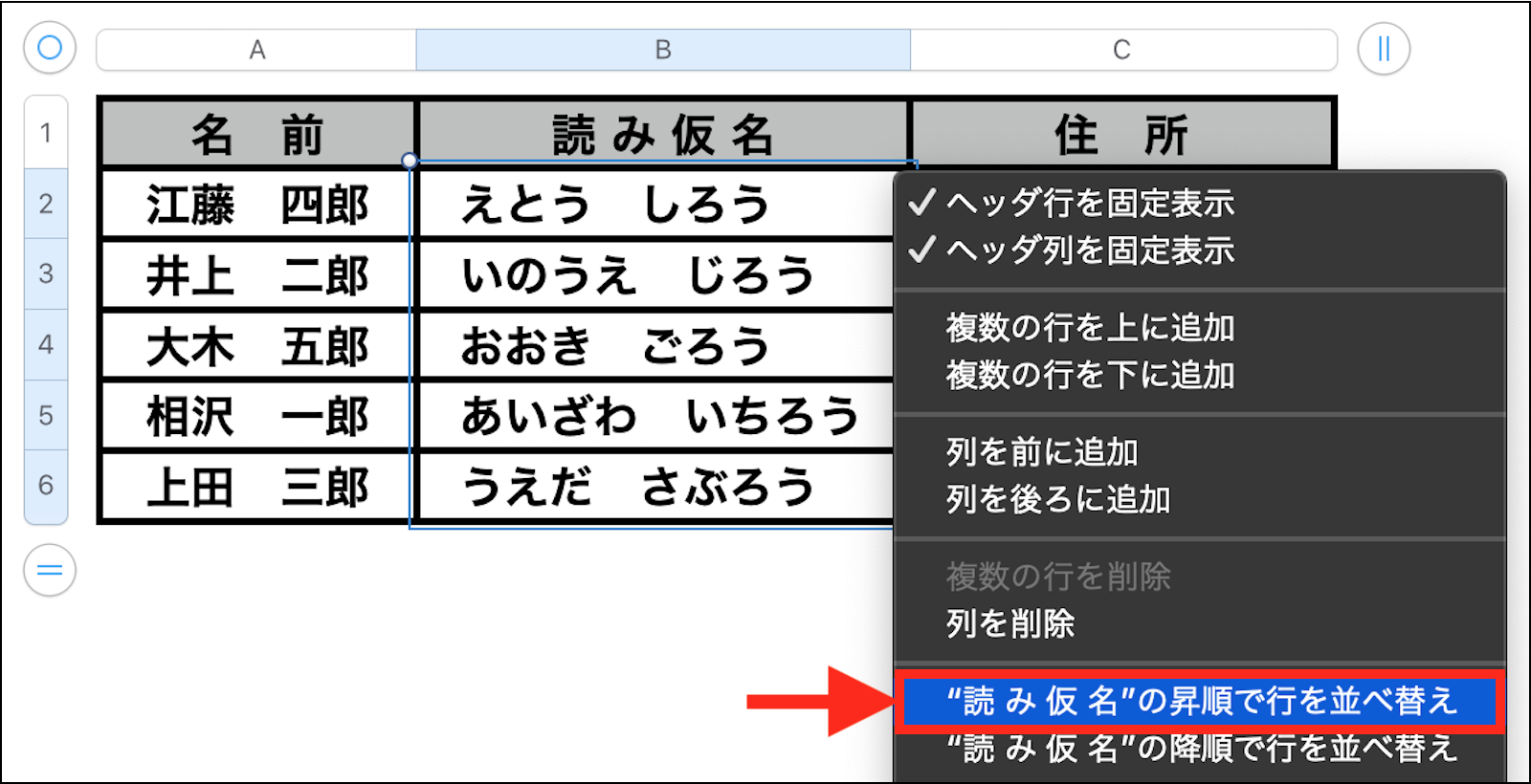 表示されるコンテキストメニューから、「”読み仮名”の昇り順で行を並べ替え」の項目を選択。