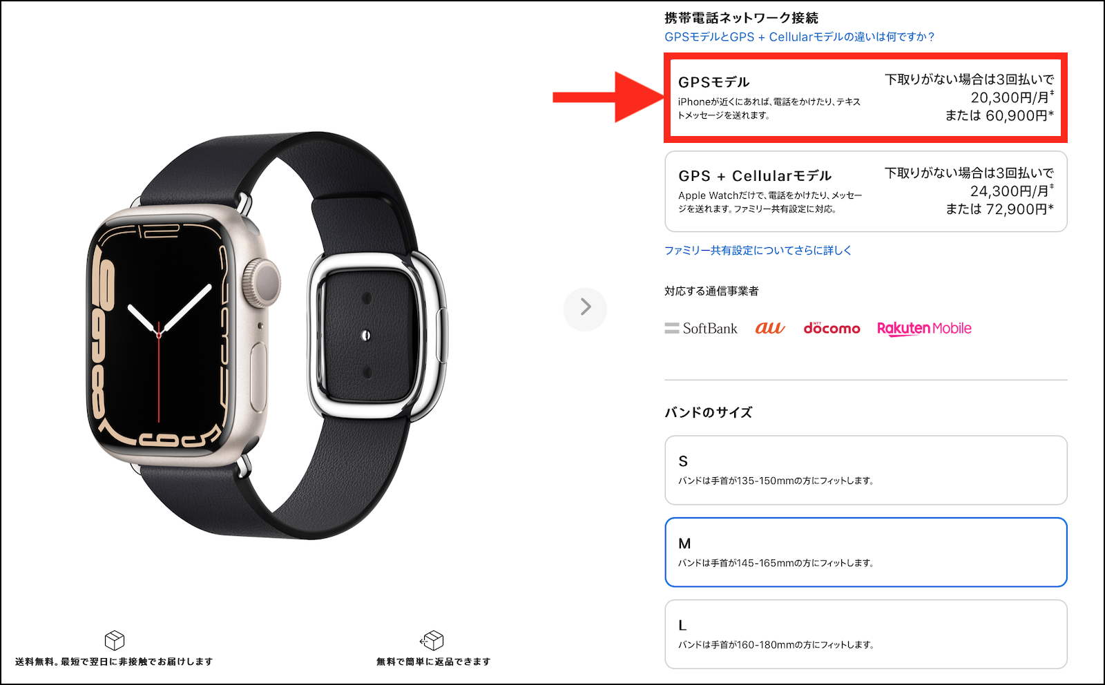 正:Apple Watch Series 7(GPS モデル)購入時に、ミッドナイトモダンバックルとの組み合わせで購入可能 ですので、以下の手順で購入して下さい。