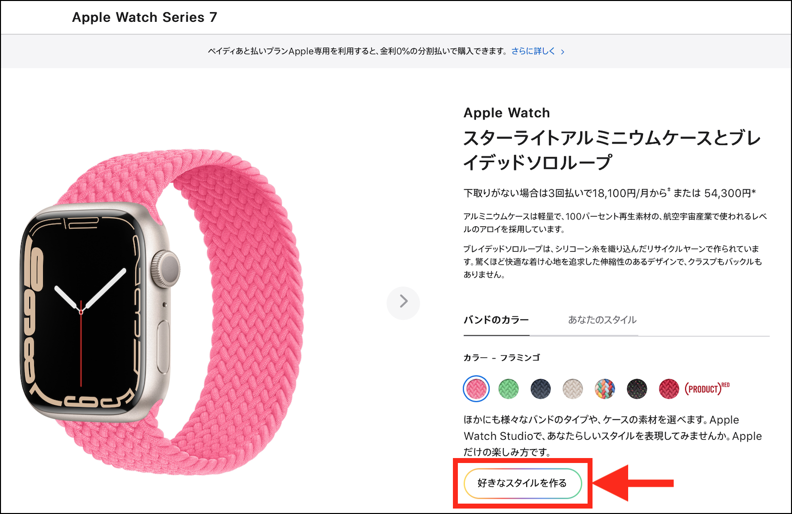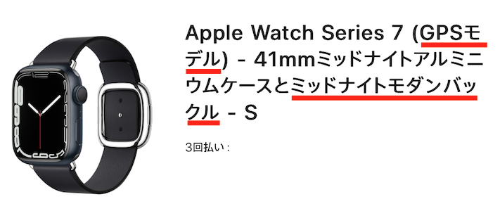 もし、ケースの素材がアルミニウムでも構わないと言う場合は、Apple Watch Series 7 購入時に、ミッドナイトモダンバックルとの組み合わせで購入可能 ですので、以下の手順で購入して下さい。