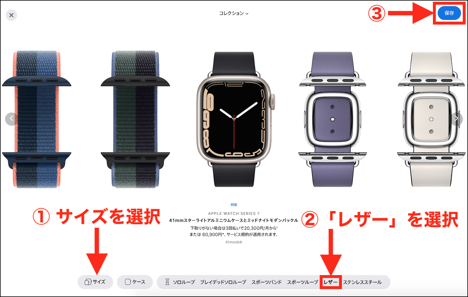 4.画面下側の「サイズ」アイコンを選択してケースのサイズ(41 mm または 45 mm)を選択し、「バンド」アイコンを選択して「レザー」を選択し、画面右上に有る「保存」ボタンをクリック。