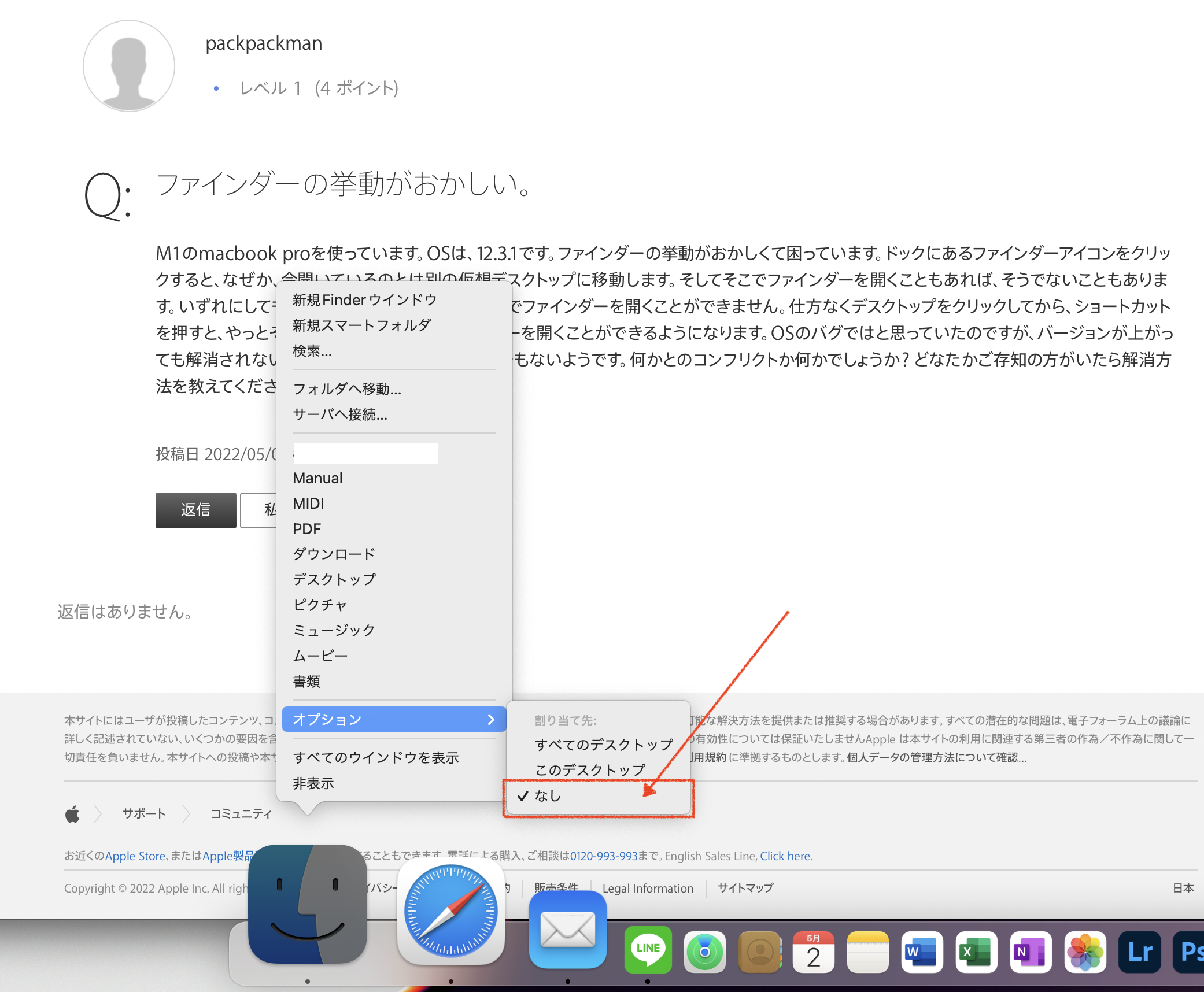 M1のmacbook proを使っています。OSは、12.3.1です。ファインダーの挙動がおかしくて困っています。ドックにあるファインダーアイコンをクリックすると、なぜか、今開いているのとは別の仮想デスクトップに移動します。そしてそこでファインダーを開くこともあれば、そうでないこともあります。いずれにしても、今使っている仮想デスクトップでファインダーを開くことができません。仕方なくデスクトップをクリックしてから、ショートカットを押すと、やっとその仮想デスクトップでファインダーを開くことができるようになります。OSのバグではと思っていたのですが、バージョンが上がっても解消されないし、そもそもそういうバグの報告もないようです。何かとのコンフリクトか何かでしょうか?どなたかご存知の方がいたら解消方法を教えてください。