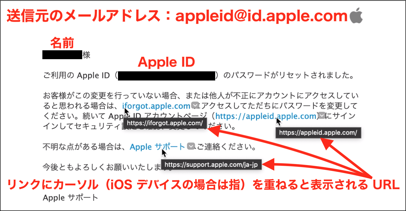 文面は「Apple IDのパスワードがリセットされました」と記載がありhttps://iforgot.apple.com/に誘導されます。