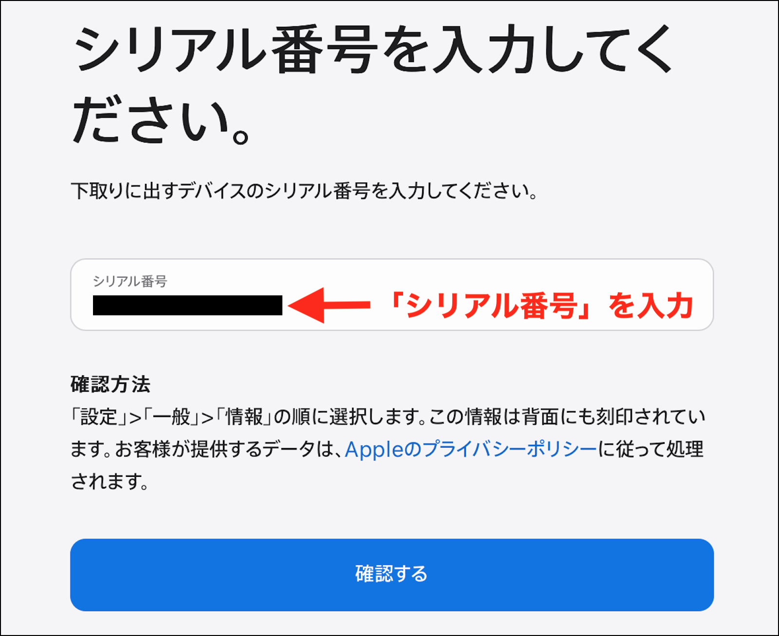 表示される「製造メーカー」の選択画面で、「Apple」を選択すると表示される「シリアル番号」の入力画面の入力欄に、ココッチさんがお使いの iPad の「シリアル番号」を入力して、「確認する」ボタンをクリック(またはタップ)し、ココッチさんがお使いの iPad が「下取り」の対象になるかどうかを確認して見て下さい。