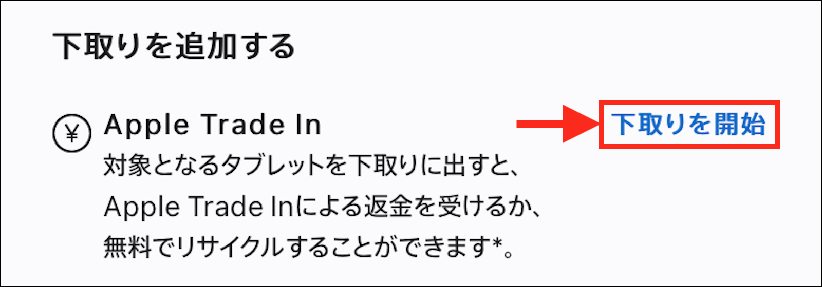 ココッチさんがお使いの iPad のモデル及び状態によっては、新規製品購入に伴う「下取り」の対象になる可能性が有ります ので、iPad - Apple(日本) のページで買い替えを検討しているモデルの「購入」ボタンをクリック(またはタップ)して、「下取りを追加する」のセクションで、下の画像の様に「下取りを開始」のリンクをクリック(またはタップ)し、