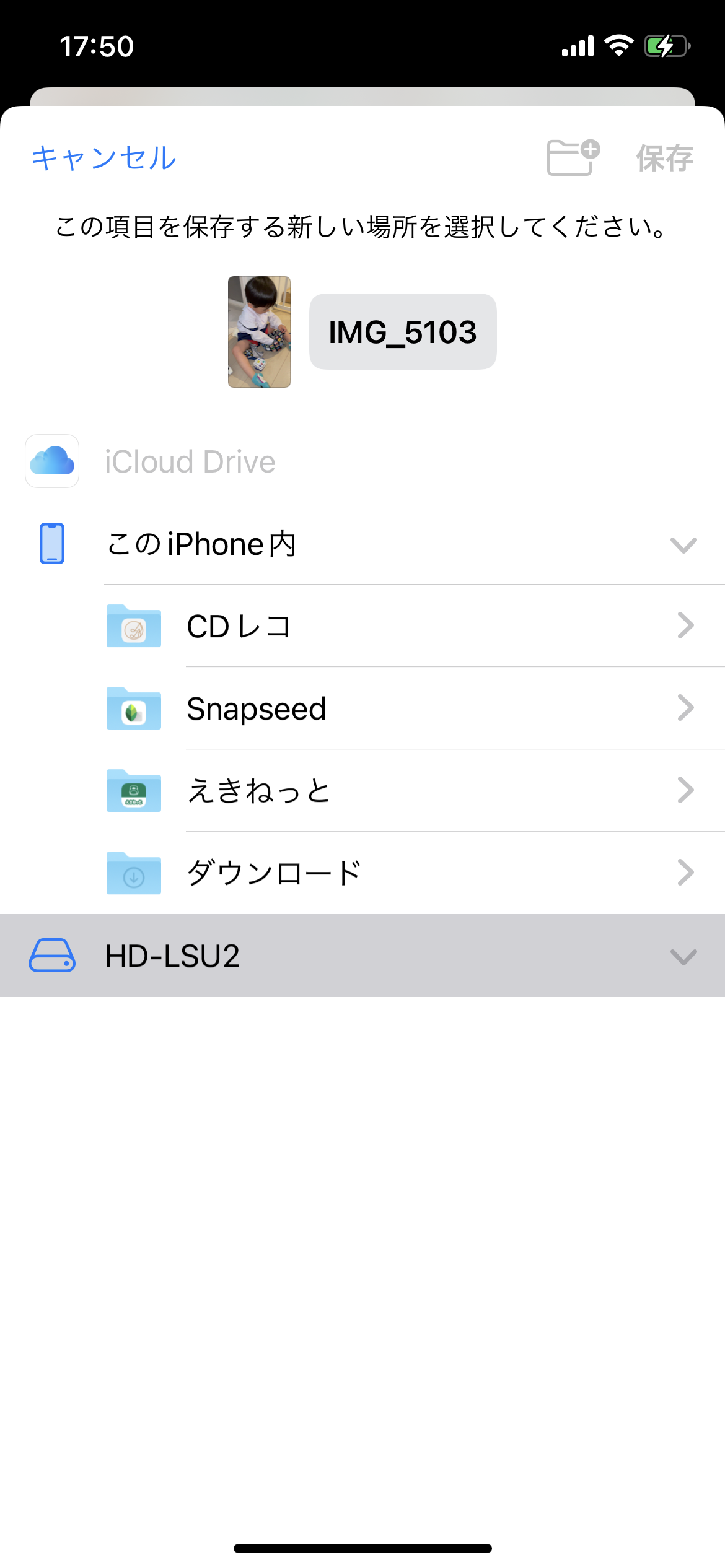 外付けHDDをiPhoneとライトニングUSB3カメラアダプターで接続し、iPhoneのファイルにHDDが表示はされました。その中の写真は開いて本体へ保存する事はできるのですが、本体の写真や、HDDの中の写真を再度またHDDへ保存しようとしても保存のボタンが押せない状態になります。