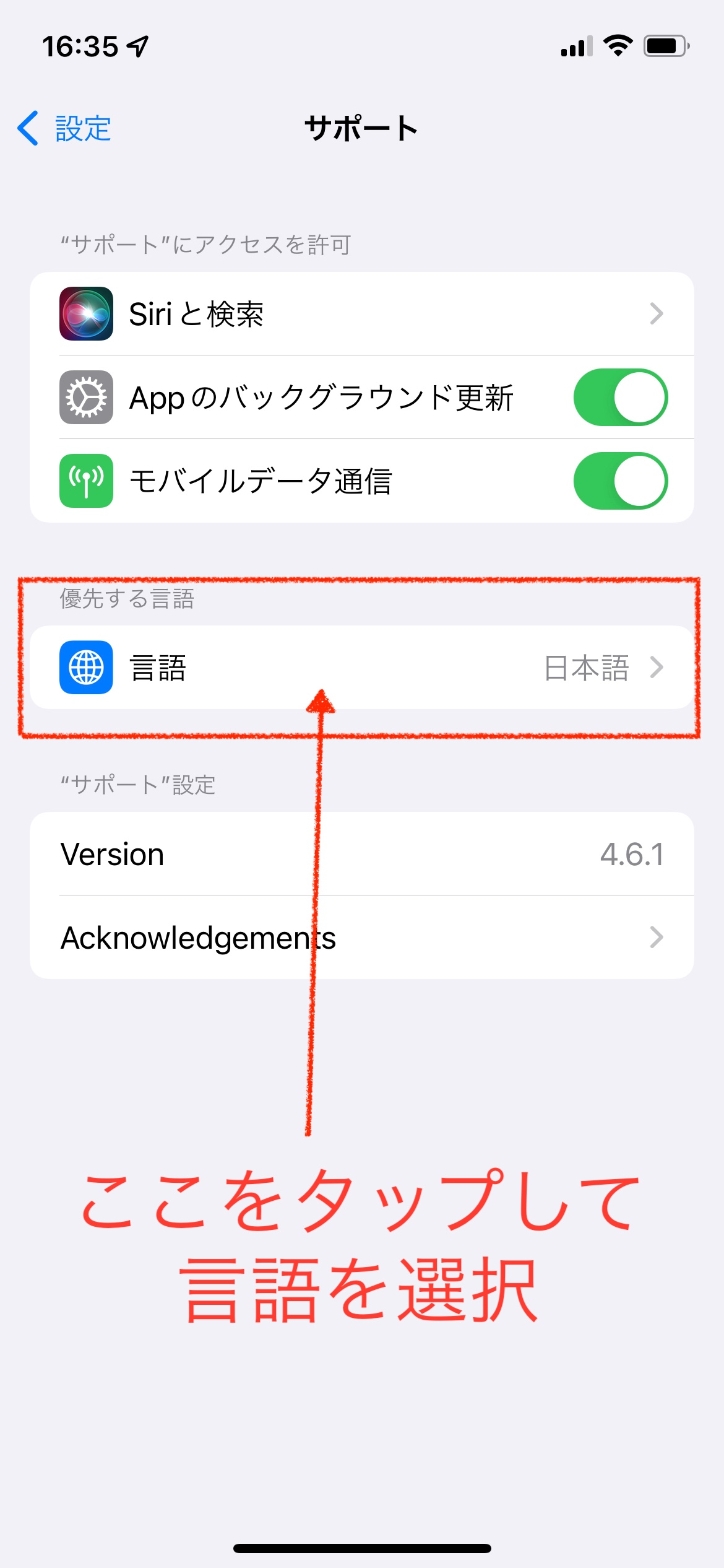 設定>サポート(アプリ欄)>言語を見直してみましょう