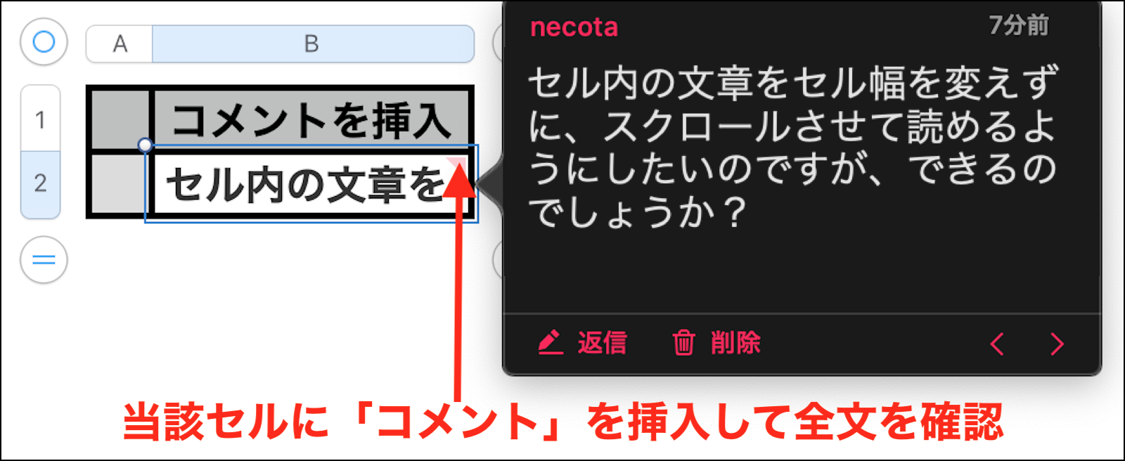 また、いちいち確認の為に、「Numbers」ウインドウ最下段の「セルの内容を表示」フィールドまで視線を移動するのが面倒と言う場合は、当該セルを選択して「コメント」を挿入し、セルの内容をコピー&ペーストして置けば、下の画像の様に当該セルの右上隅をクリックしてコメントを表示させ、全文を確認する事が出来ます。