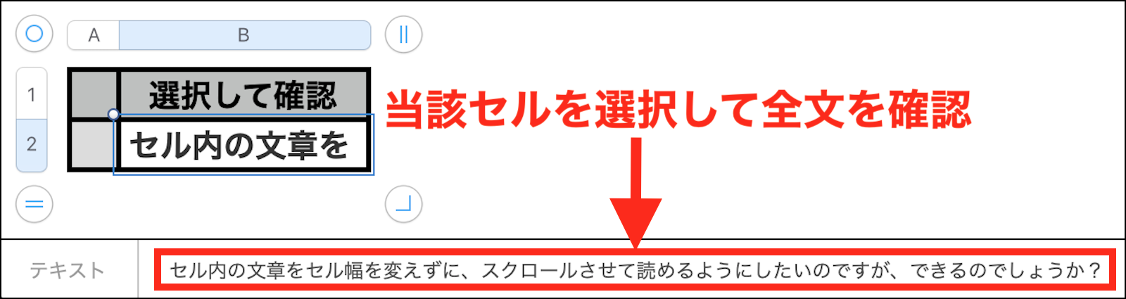 スクロールは出来ませんが、セル内のテキストを確認するだけなら、下の画像の様に当該セルを選択するだけで、「Numbers」ウインドウ最下段に有る「セルの内容を表示」フィールドで全文確認出来ます。