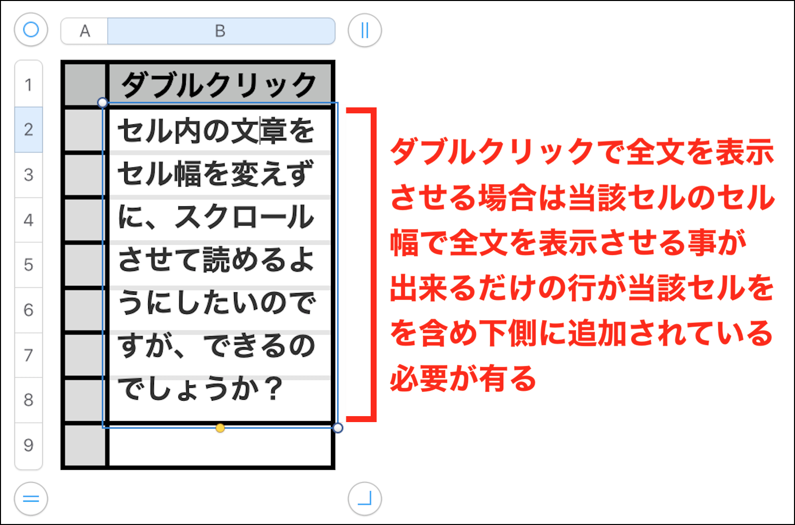 只、当該セルをダブルクリックして全文を表示させる場合は、下の画像の様に、当該セルのセル幅で、全文を表示させる事が出来るだけの行が、当該セルを含め下側に追加されている必要が有りますので、ご注意下さい。