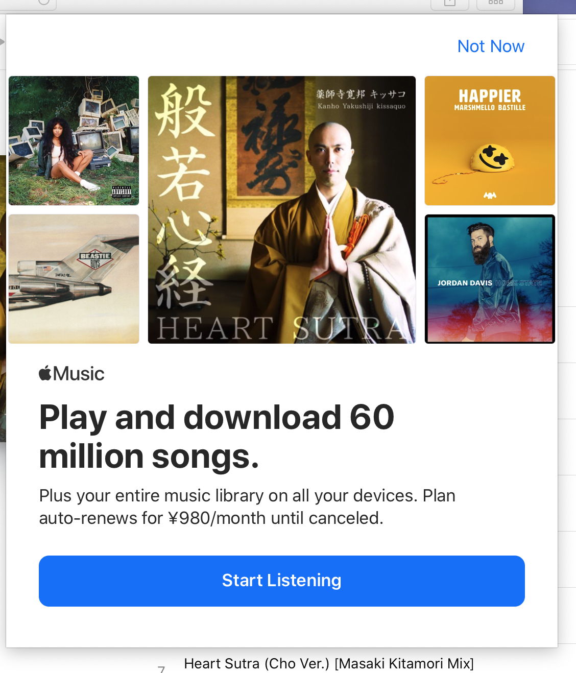 西国33箇所をまわるために「般若心経」が必要なのでApplemusicで検索して購入しようとしておりました。いつもなら視聴して気に入ったものをダウンロードしていたのですが、添付のようなAppleMusicへの加入の広告が出ます。試したら全部そのようになっています。