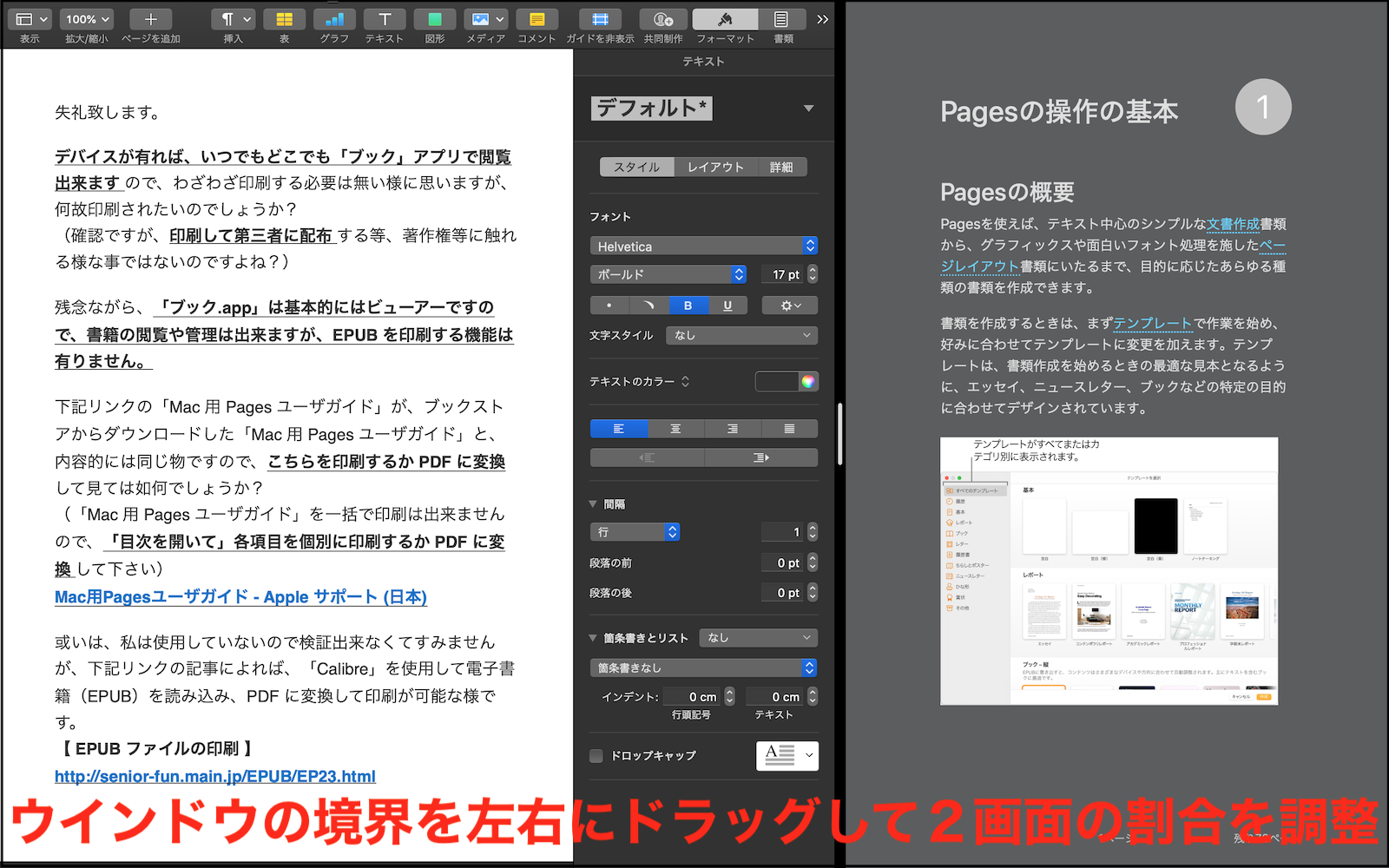 下記リンクの「Split View」を使用すれば、ウインドウを手動で動かしてサイズを変えたりしなくても、Mac の画面に「Pages」と「ブック」を左右に並べて表示出来ます。