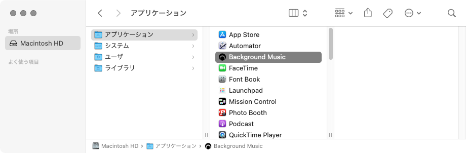 まず、次の2つを手動でゴミ箱に捨ててください。(事前に Background Music.app を終了しておいてください)