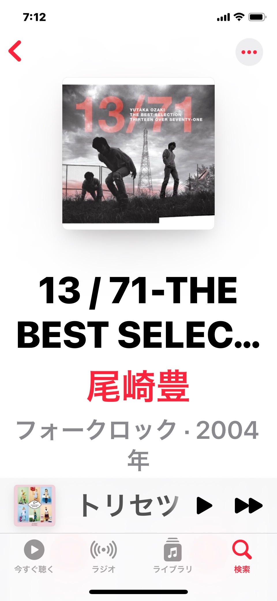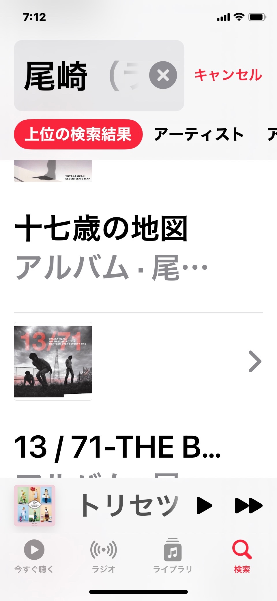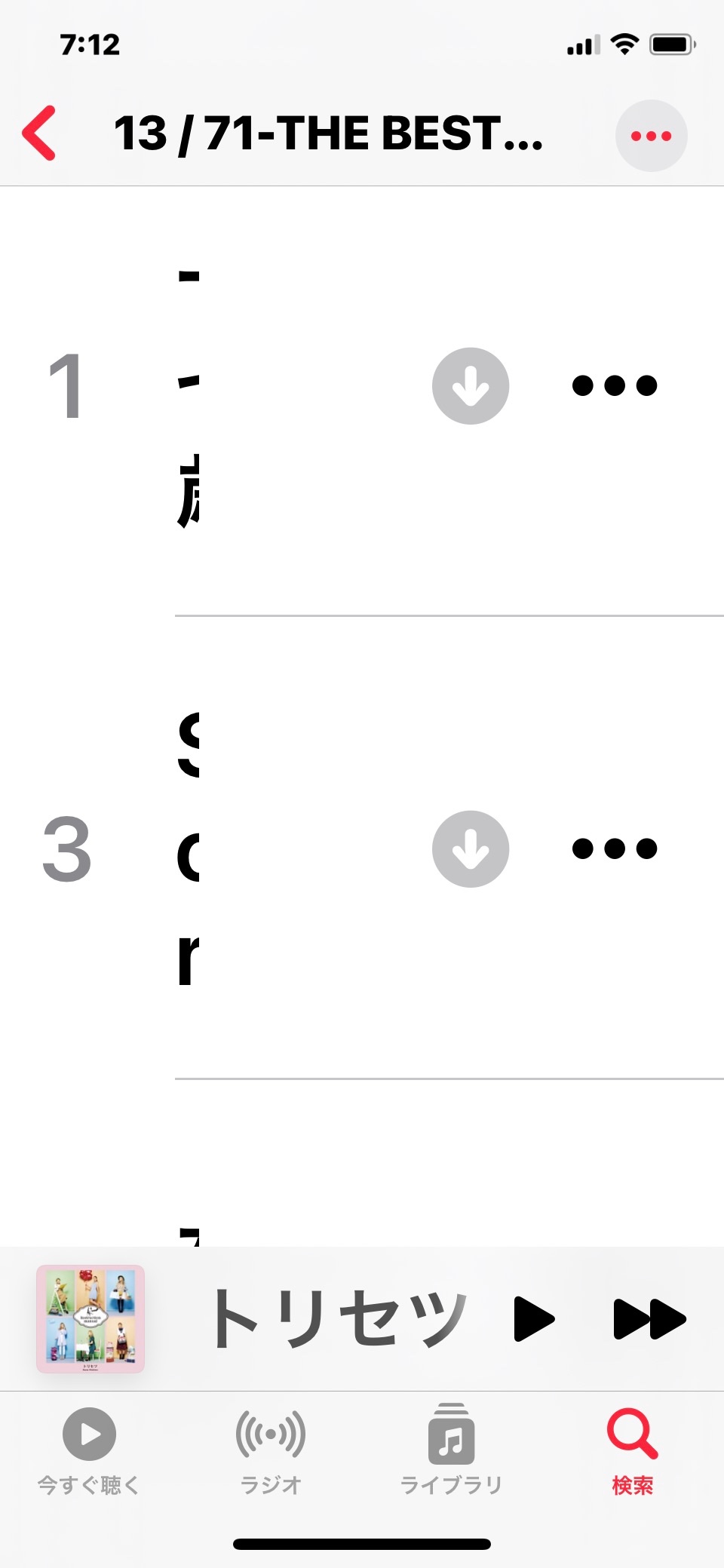 でも、文字の大きさを最大にして試してみたのですが、スクリーンショットで提示していただいた「13/71 - THE BEST SELECTION」というアルバムでも、私のところでは、そんな風に文字が半分に断ち切られたような表示にはなりません。ただ、下向きの↓はダウンロード済みということですよね。試しに1曲目の「十七歳の地図」をダウンロードしてみたら、下向きの↓が出たとたんに曲名が消えてしまいました。私の場合、まったく表示されない(かけらもない)のは、たぶんiPhone SE2で画面が小さいからだと思います。