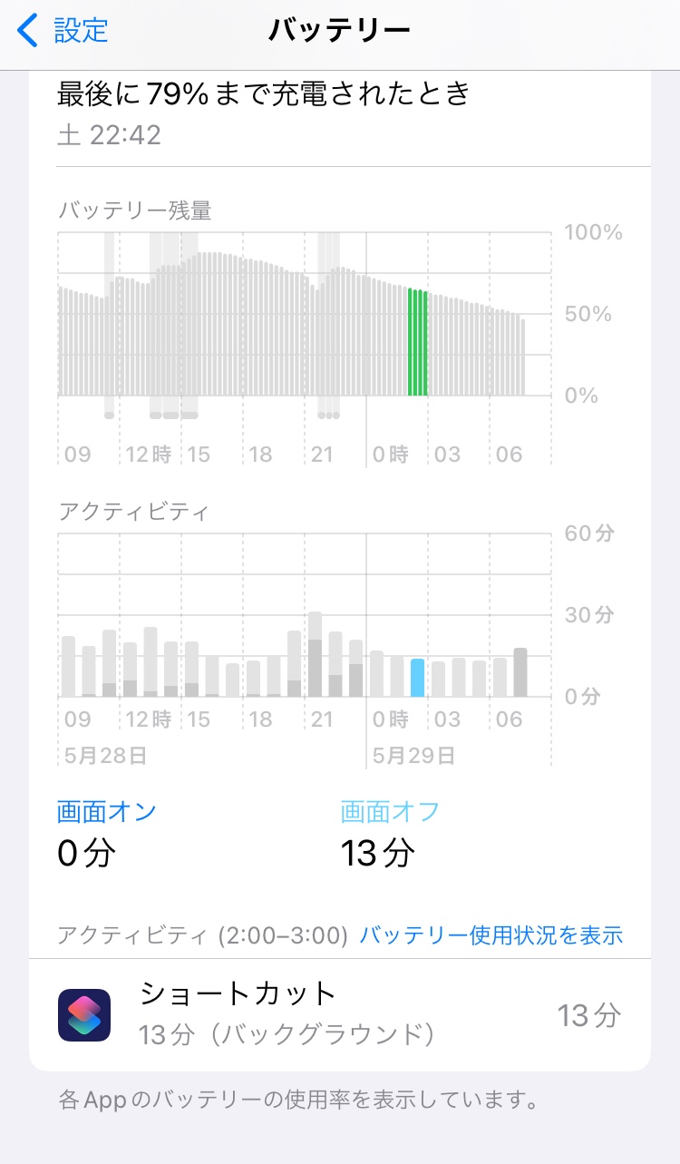 ショートカットアプリは、組んでいたオートメーションを全て無効にしましたが、電池の減りは変わりませんでした。