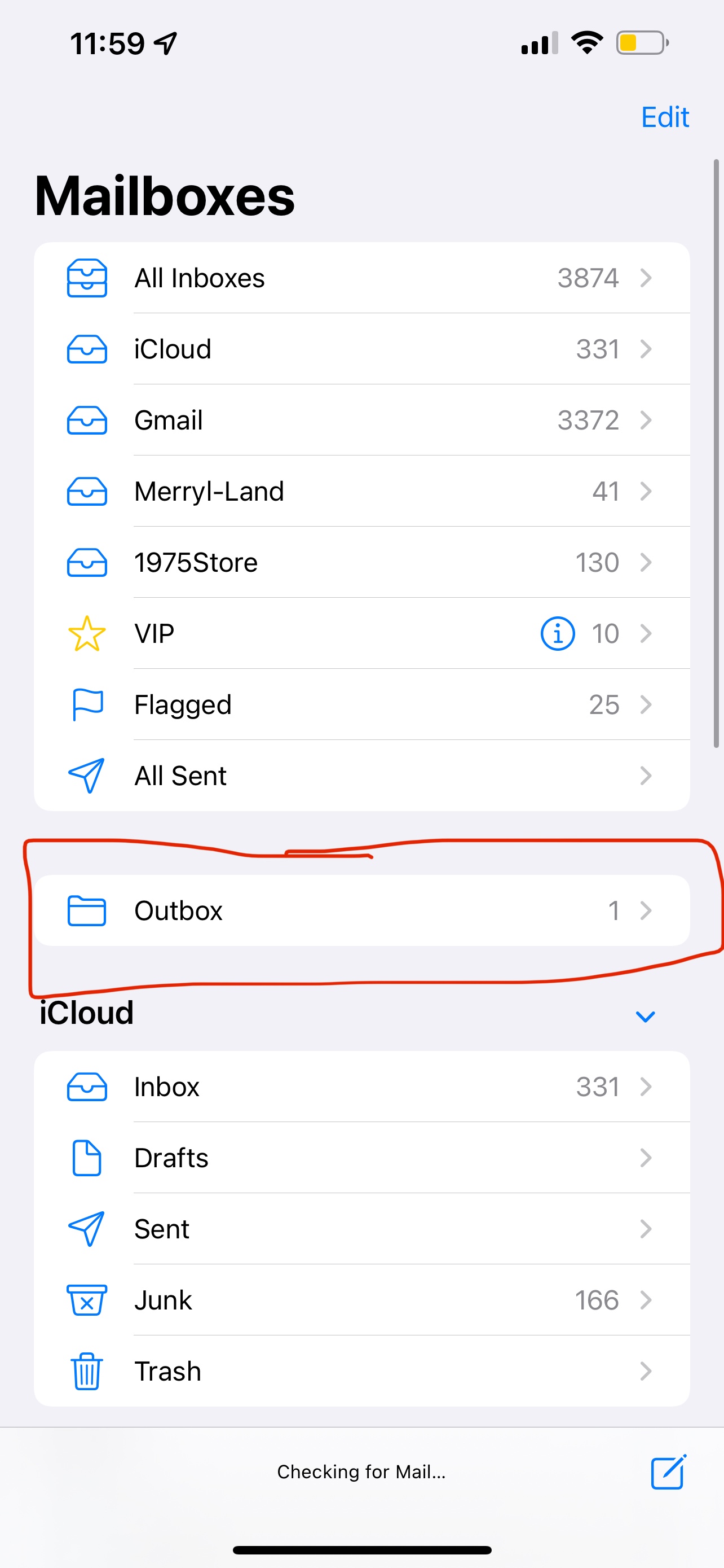 写真の通りにですが、iPhoneで会社のEメールアドレスを保存しました、iPhoneからメールの送信ができません、Outbox(送信トレイ)にまっすぐ入るかたちてす。