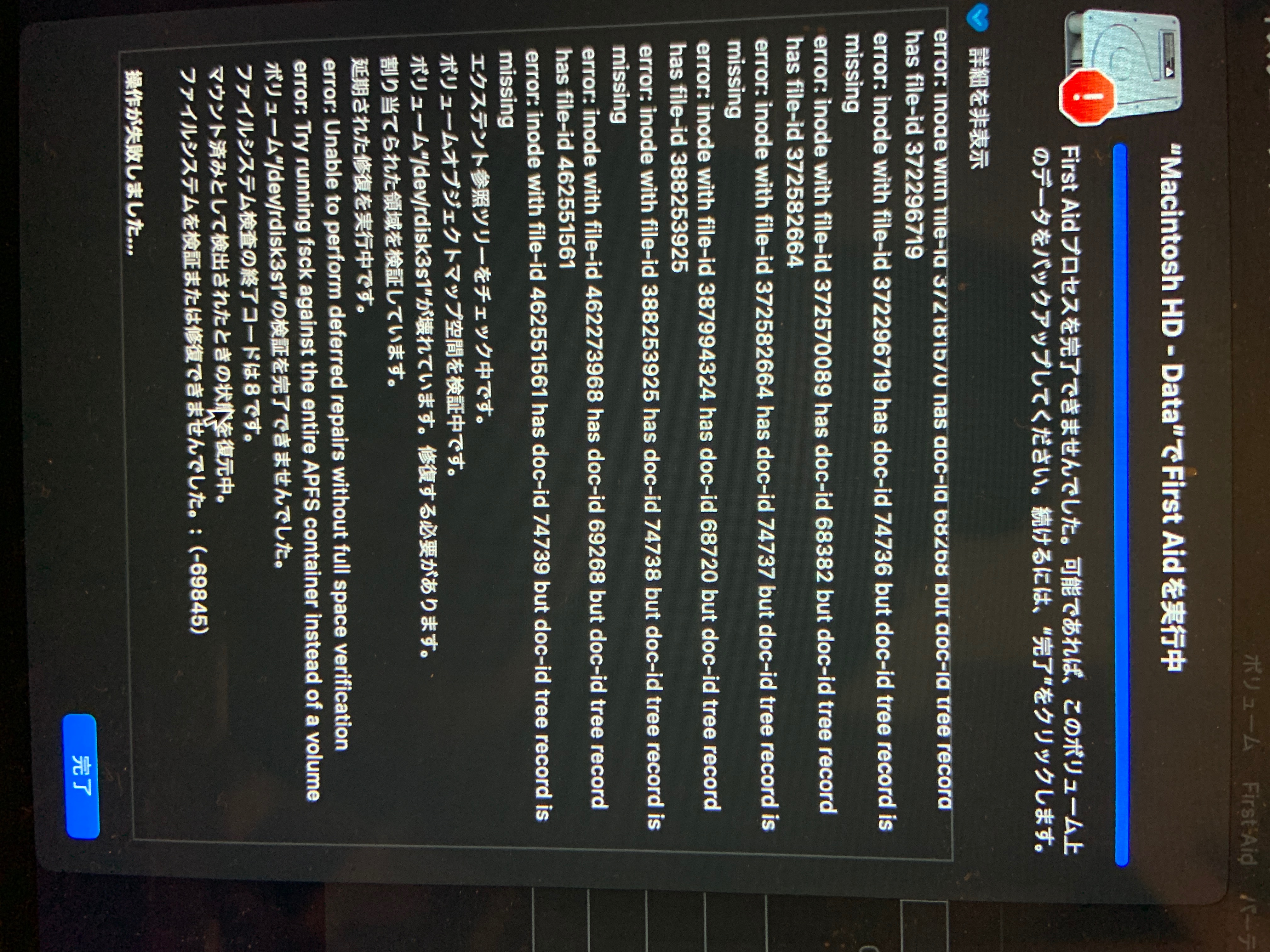 もう一度、Macintosh HD - Dataに対してfirst aidかけてみるとどうですか?