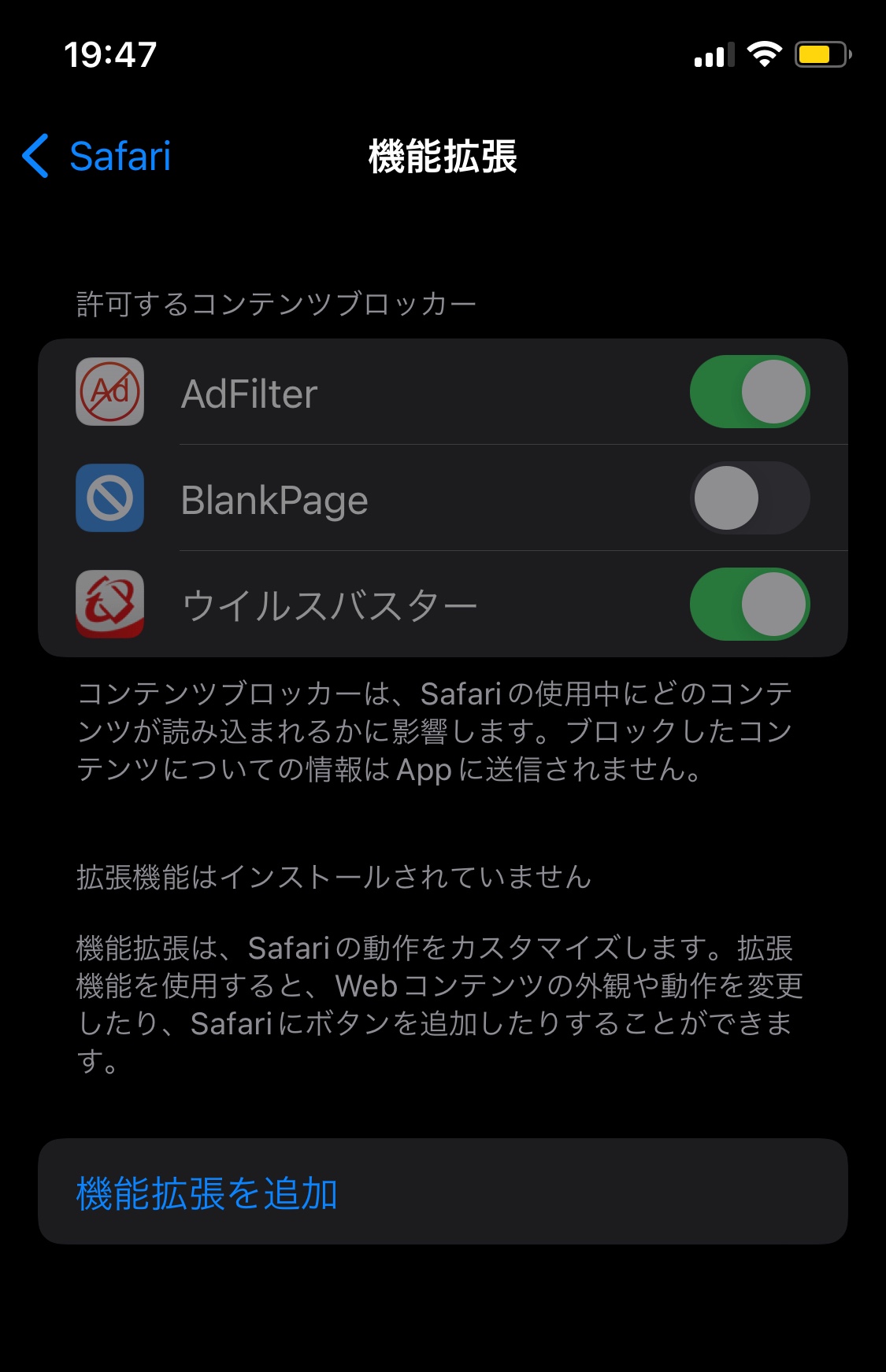 BlankPageという機能拡張をインストールし、「設定」→「Safari」→「機能拡張」でONにしようとしましたが、写真のようにメニュー全体がグレートーンになっており、スイッチが一切動かせない状態です。