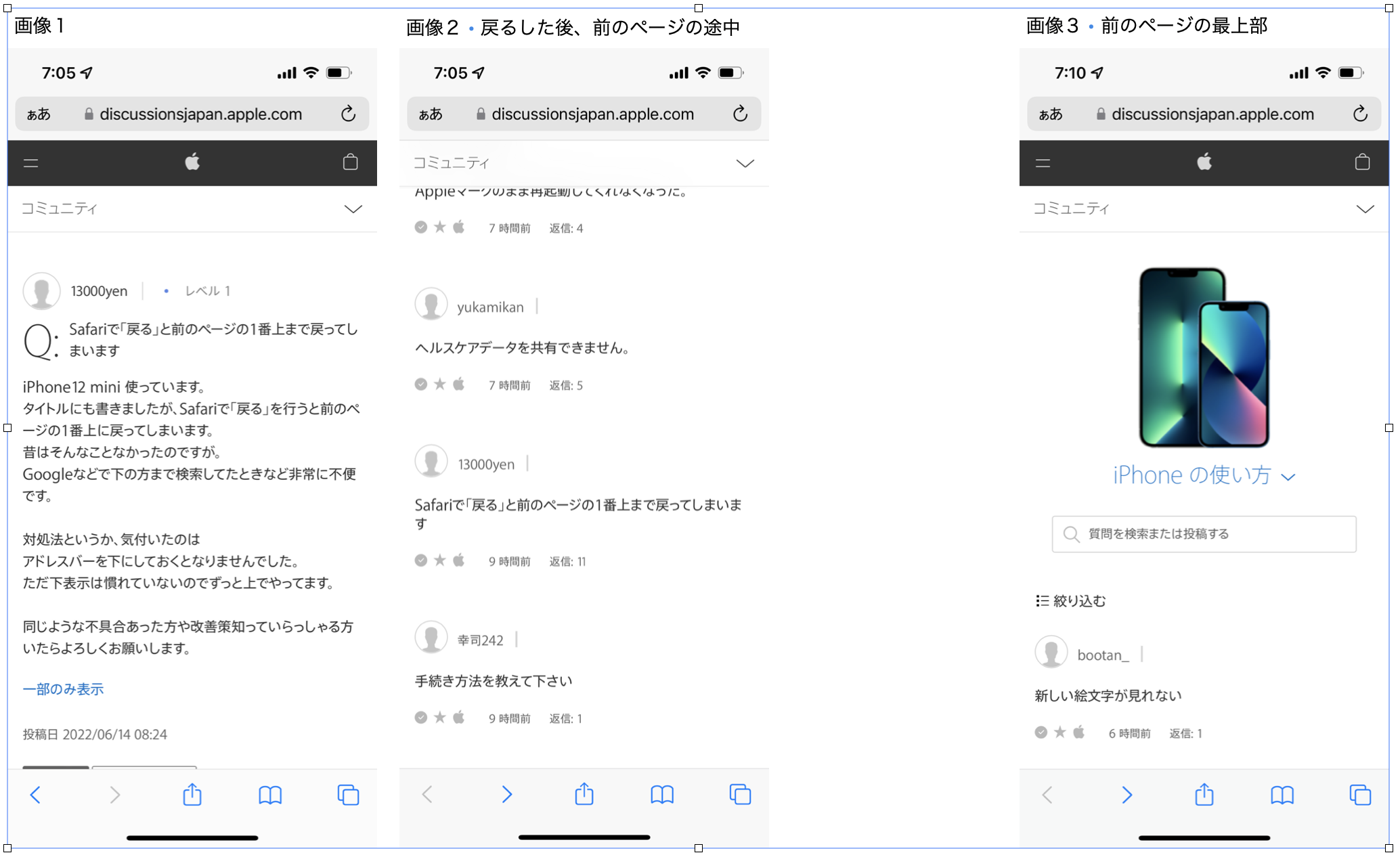 Safariで「戻る」と前のページの1番上まで戻ってしまいます