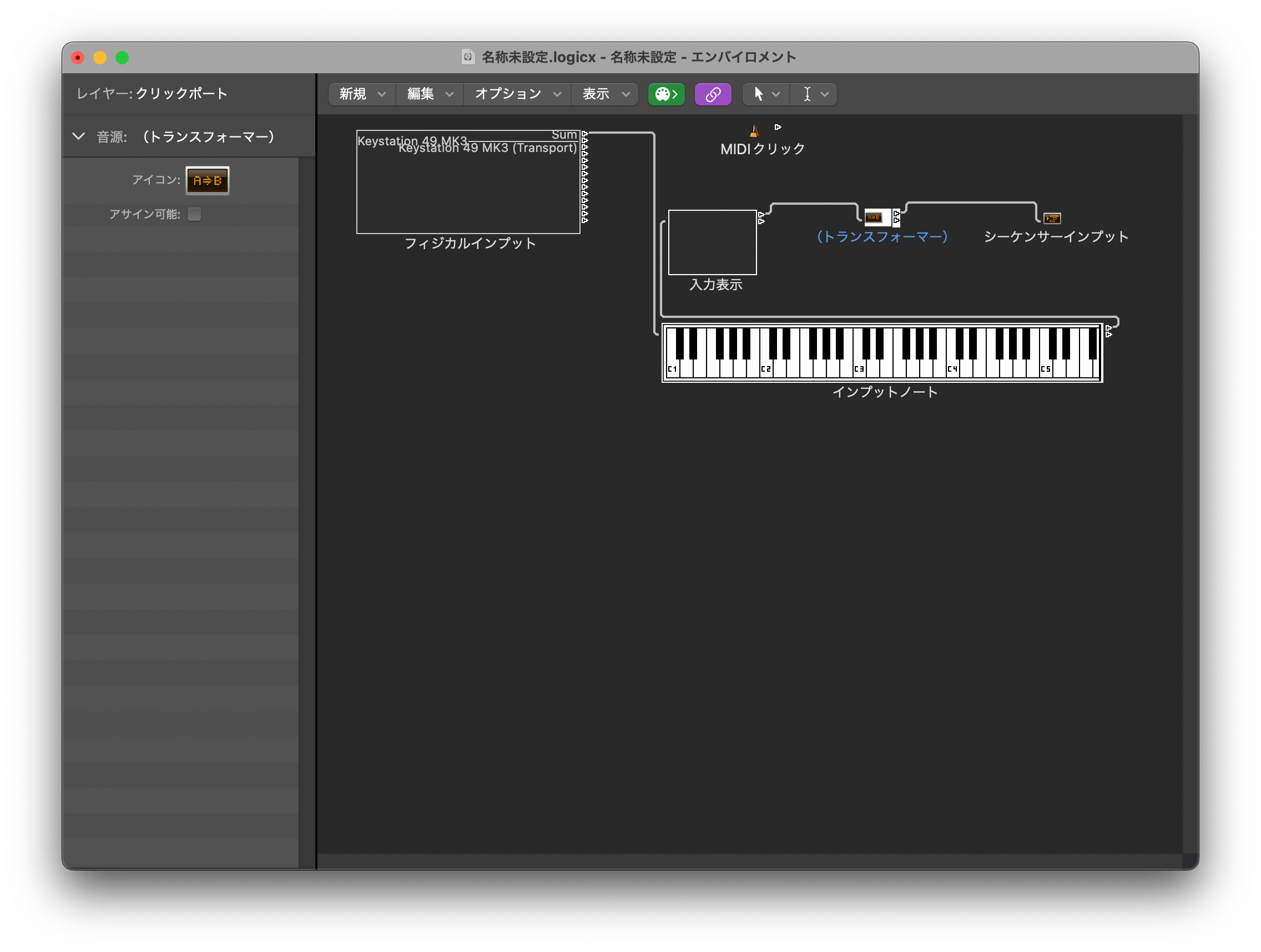 ・MIDIエンバイロメント機能を使用し、フィジカルインプットとシーケンサーインプット間にトランスフォーマーを接続、トランスフォーマーの設定からベロシティを固定化