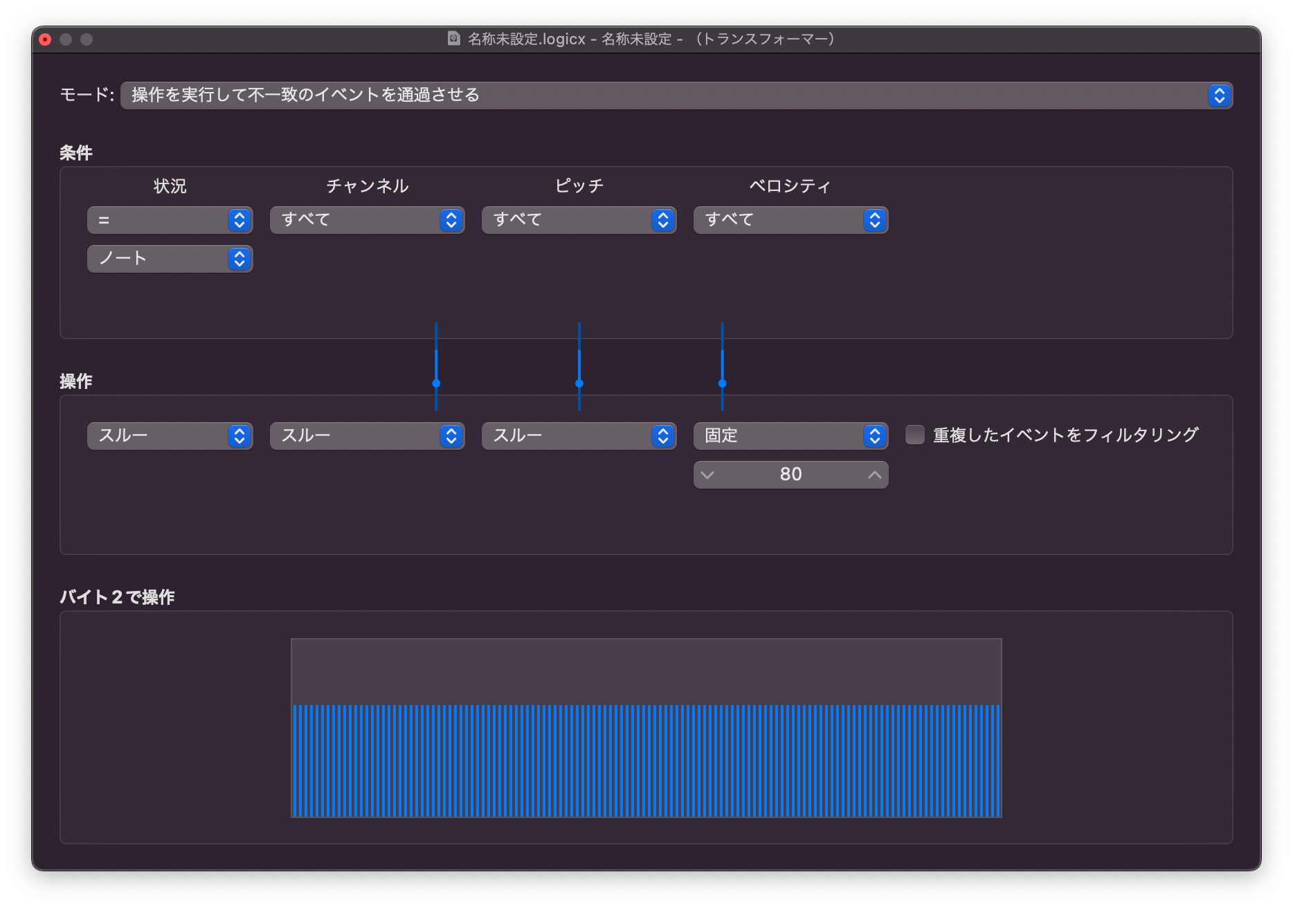 この方法により、確かに通常録音時のベロシティを固定化することはできたのですが、どうやらステップ入力時のMIDI信号はMIDIエンバイロメントを介していないようで元のベロシティが入力されてしまいます。