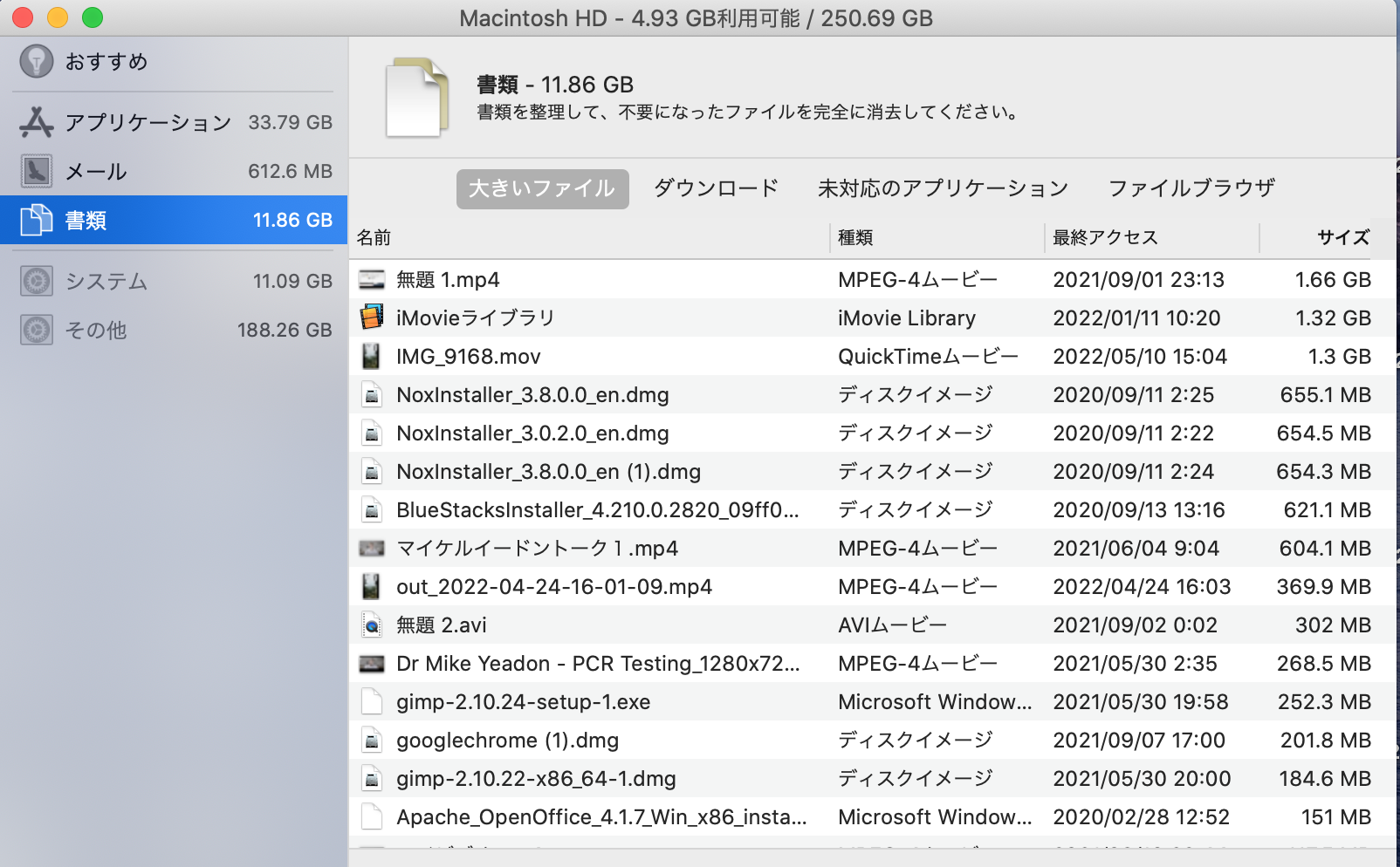 書類とダウンロードとかアプリケーションは見えるのですがほとんど保存してないので20G程度